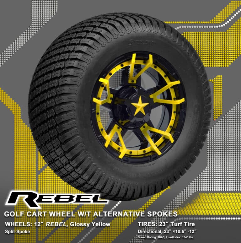 BNDL-TR1206-WH1251-WIRB37-LN0002 – SGC 12″ REBEL Glossy Black Wheel – Aluminum Alloy / STEELENG 23″x10.5″-12″ Turf Tire / REBEL Inserts-Split Spoke-Glossy Yellow