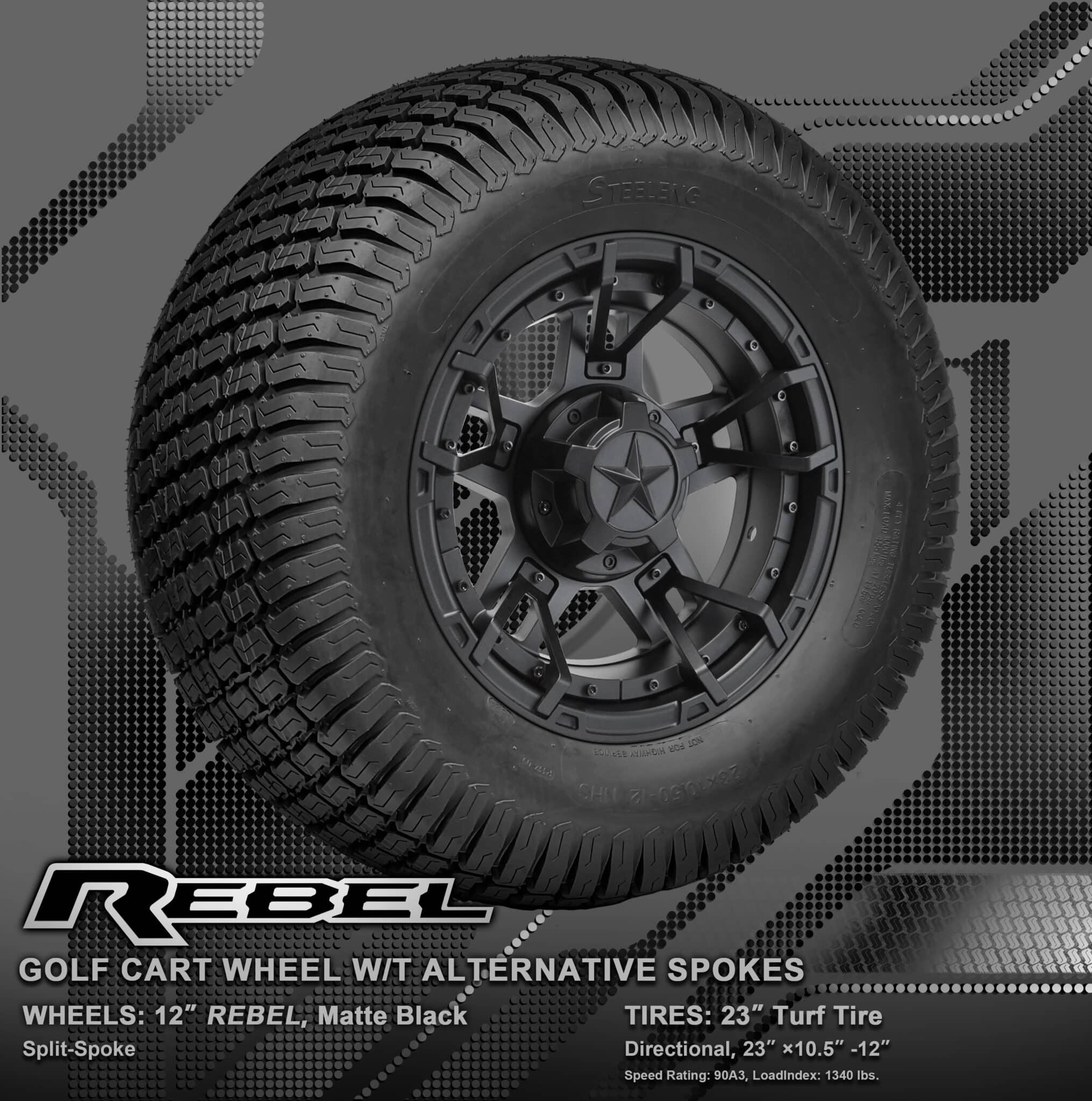 BNDL-TR1206-WH1251-WIRB39-LN0002 – SGC 12″ REBEL Glossy Black Wheel – Aluminum Alloy / STEELENG 23″x10.5″-12″ Turf Tire / REBEL Inserts-Split Spoke-Matte Black