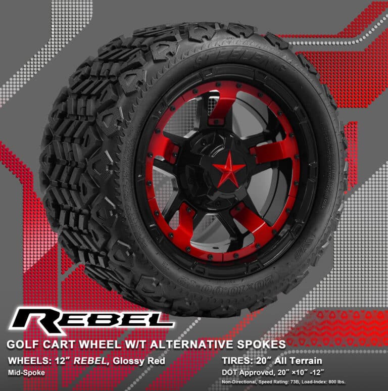 BNDL-TR1207-WH1251-WIRB08-LN0002 – SGC 12″ REBEL Glossy Black Wheel – Aluminum Alloy / STEELENG 20″x10″-12″ All Terrain Tire DOT approved / REBEL Inserts-Mid Spoke-Glossy Red