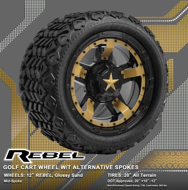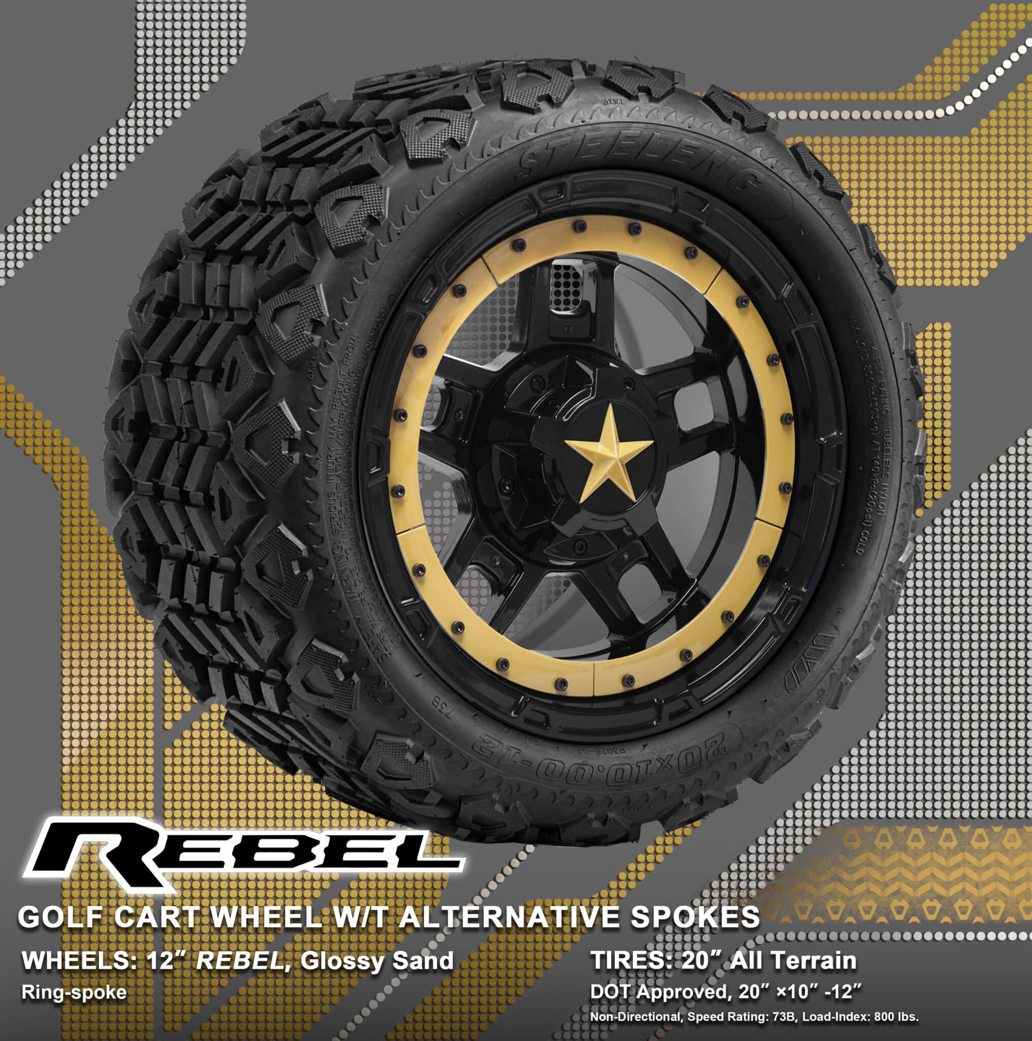 BNDL-TR1207-WH1251-WIRB09-LN0002 – SGC 12″ REBEL Glossy Black Wheel – Aluminum Alloy / STEELENG 20″x10″-12″ All Terrain Tire DOT approved / REBEL Inserts-Mid Spoke-Glossy Sand