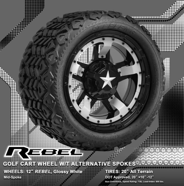 BNDL-TR1207-WH1251-WIRB10-LN0002 – SGC 12″ REBEL Glossy Black Wheel – Aluminum Alloy / STEELENG 20″x10″-12″ All Terrain Tire DOT approved / REBEL Inserts-Mid Spoke-Glossy White
