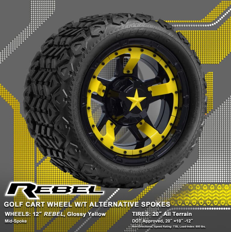 BNDL-TR1207-WH1251-WIRB11-LN0002 – SGC 12″ REBEL Glossy Black Wheel – Aluminum Alloy / STEELENG 20″x10″-12″ All Terrain Tire DOT approved / REBEL Inserts-Mid Spoke-Glossy Yellow