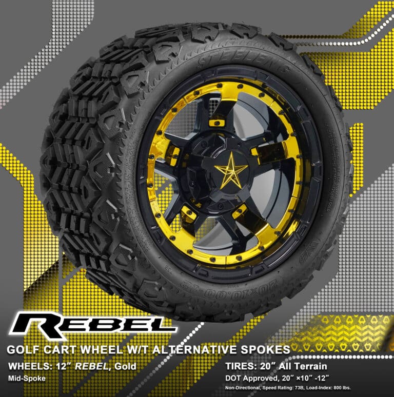 BNDL-TR1207-WH1251-WIRB12-LN0002 – SGC 12″ REBEL Glossy Black Wheel – Aluminum Alloy / STEELENG 20″x10″-12″ All Terrain Tire DOT approved / REBEL Inserts-Mid Spoke-Gold