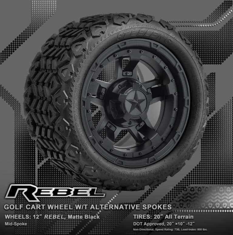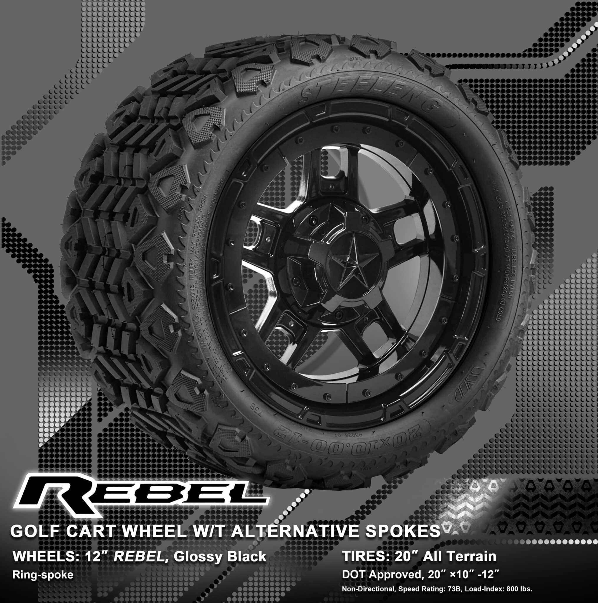 BNDL-TR1207-WH1251-WIRB13-LN0002 – SGC 12″ REBEL Glossy Black Wheel – Aluminum Alloy / STEELENG 20″x10″-12″ All Terrain Tire DOT approved / REBEL Inserts-Mid Spoke-Matte Black
