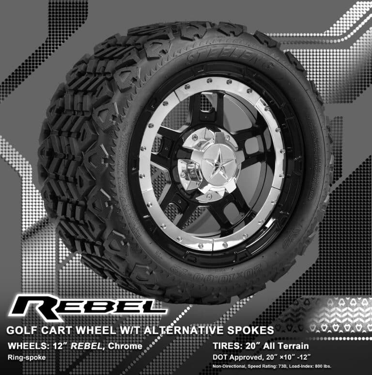 BNDL-TR1207-WH1251-WIRB15-LN0002 – SGC 12″ REBEL Glossy Black Wheel – Aluminum Alloy / STEELENG 20″x10″-12″ All Terrain Tire DOT approved / REBEL Inserts-Ring-Chrome