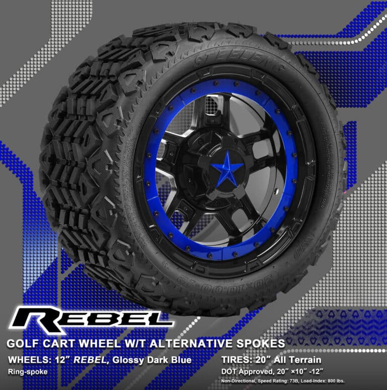BNDL-TR1207-WH1251-WIRB17-LN0002 – SGC 12″ REBEL Glossy Black Wheel – Aluminum Alloy / STEELENG 20″x10″-12″ All Terrain Tire DOT approved / REBEL Inserts-Ring-Glossy Dark Blue