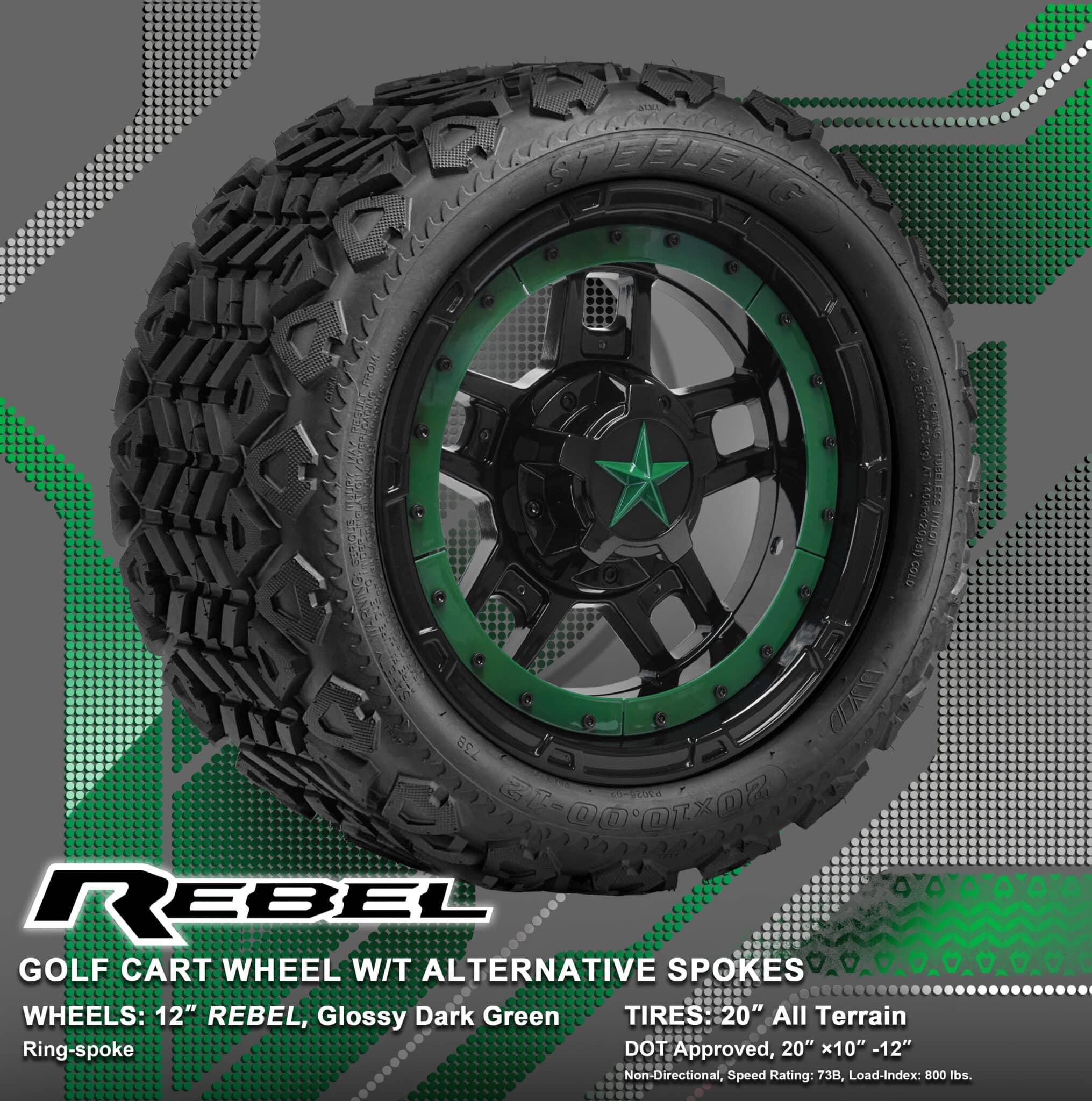 BNDL-TR1207-WH1251-WIRB18-LN0002 – SGC 12″ REBEL Glossy Black Wheel – Aluminum Alloy / STEELENG 20″x10″-12″ All Terrain Tire DOT approved / REBEL Inserts-Ring-Glossy Dark Green