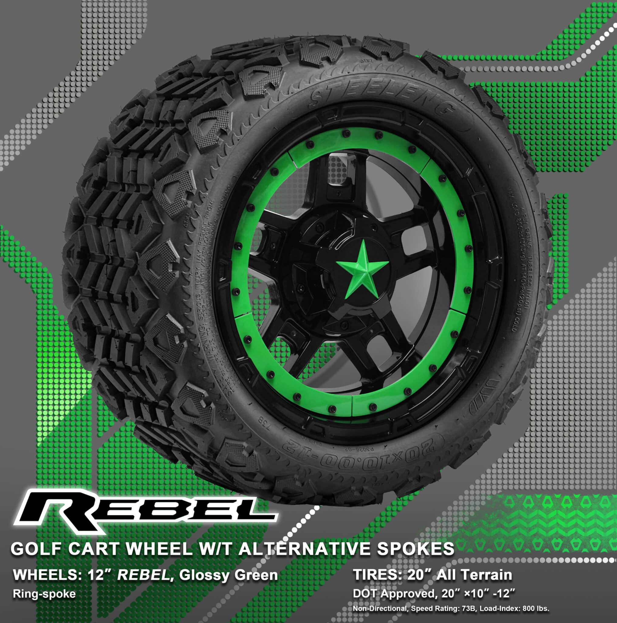 BNDL-TR1207-WH1251-WIRB19-LN0002 – SGC 12″ REBEL Glossy Black Wheel – Aluminum Alloy / STEELENG 20″x10″-12″ All Terrain Tire DOT approved / REBEL Inserts-Ring-Glossy Green