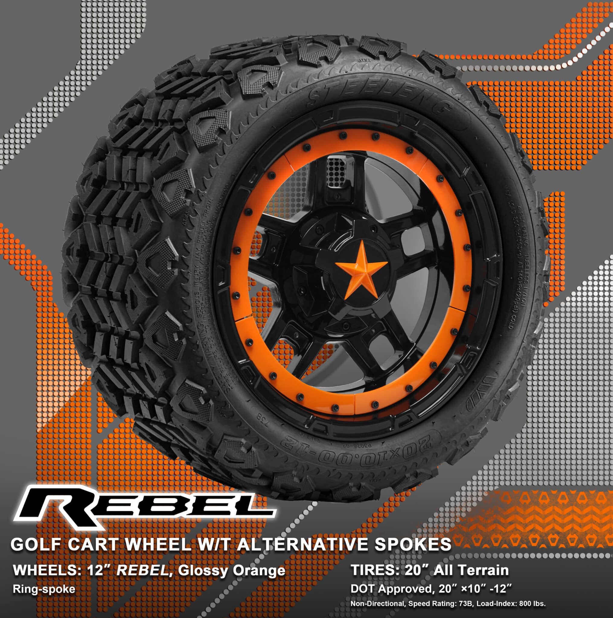 BNDL-TR1207-WH1251-WIRB20-LN0002 – SGC 12″ REBEL Glossy Black Wheel – Aluminum Alloy / STEELENG 20″x10″-12″ All Terrain Tire DOT approved / REBEL Inserts-Ring-Glossy Orange