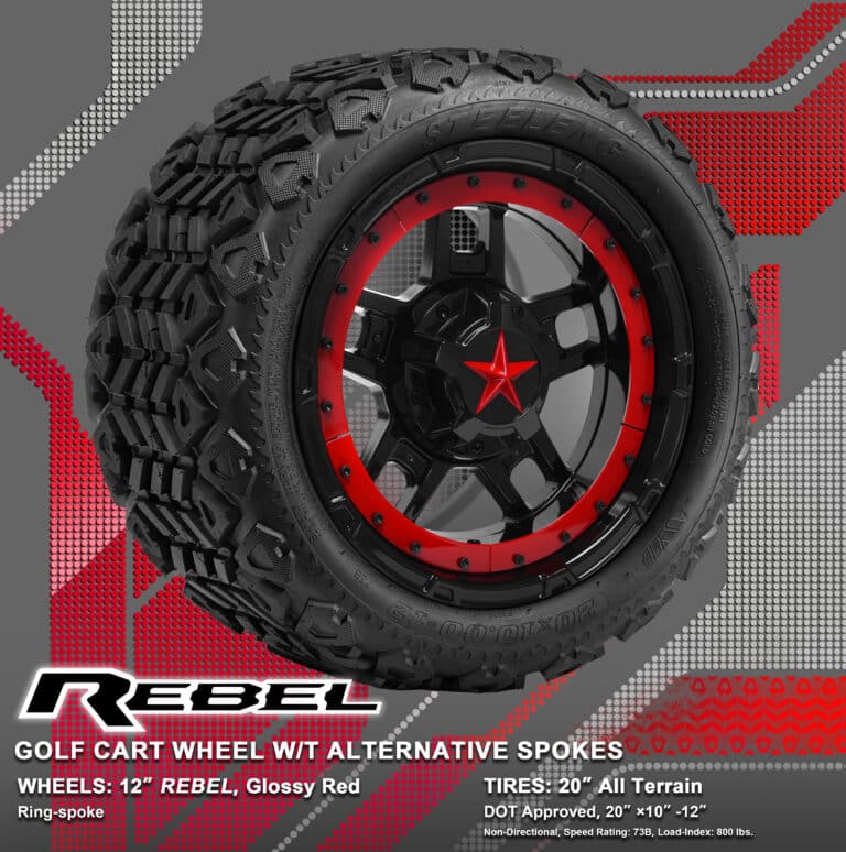 BNDL-TR1207-WH1251-WIRB21-LN0002 – SGC 12″ REBEL Glossy Black Wheel – Aluminum Alloy / STEELENG 20″x10″-12″ All Terrain Tire DOT approved / REBEL Inserts-Ring-Glossy Red