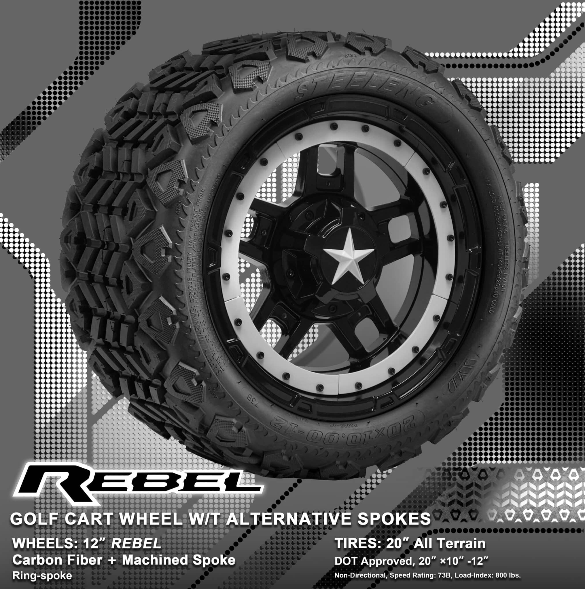 BNDL-TR1207-WH1251-WIRB14-LN0002 – SGC 12″ REBEL Glossy Black Wheel – Aluminum Alloy / STEELENG 20″x10″-12″ All Terrain Tire DOT approved / REBEL Inserts-Ring-Carbon Fiber