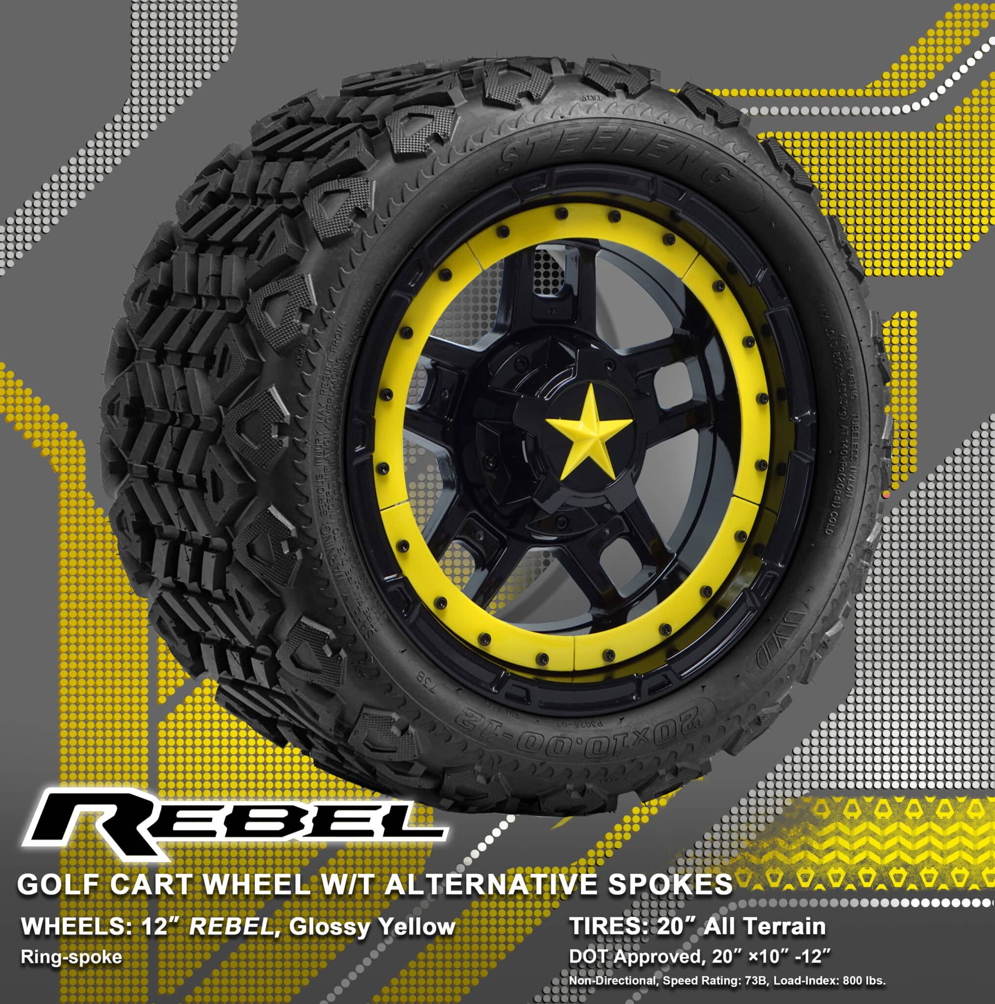 BNDL-TR1207-WH1251-WIRB24-LN0002 – SGC 12″ REBEL Glossy Black Wheel – Aluminum Alloy / STEELENG 20″x10″-12″ All Terrain Tire DOT approved / REBEL Inserts-Ring-Glossy Yellow