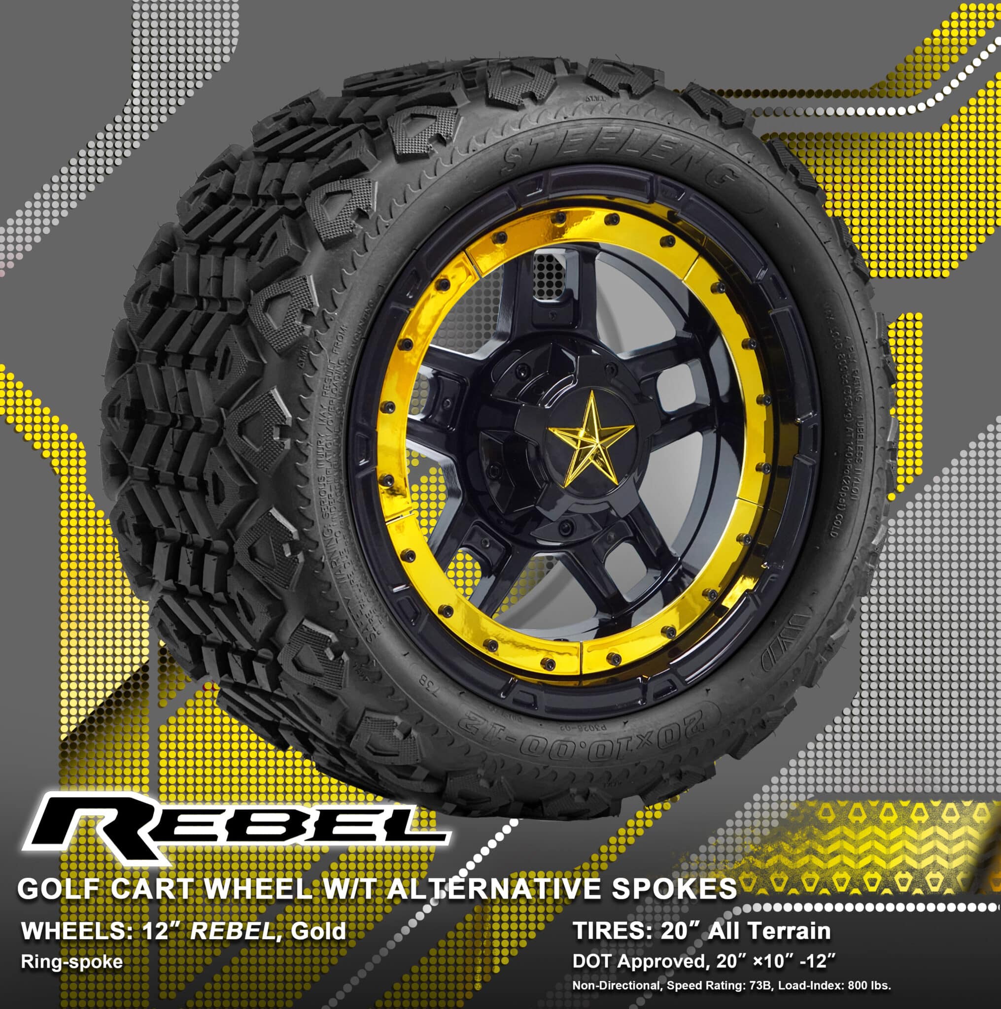 BNDL-TR1207-WH1251-WIRB25-LN0002 – SGC 12″ REBEL Glossy Black Wheel – Aluminum Alloy / STEELENG 20″x10″-12″ All Terrain Tire DOT approved / REBEL Inserts-Ring-Gold