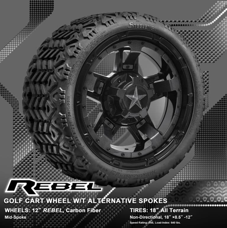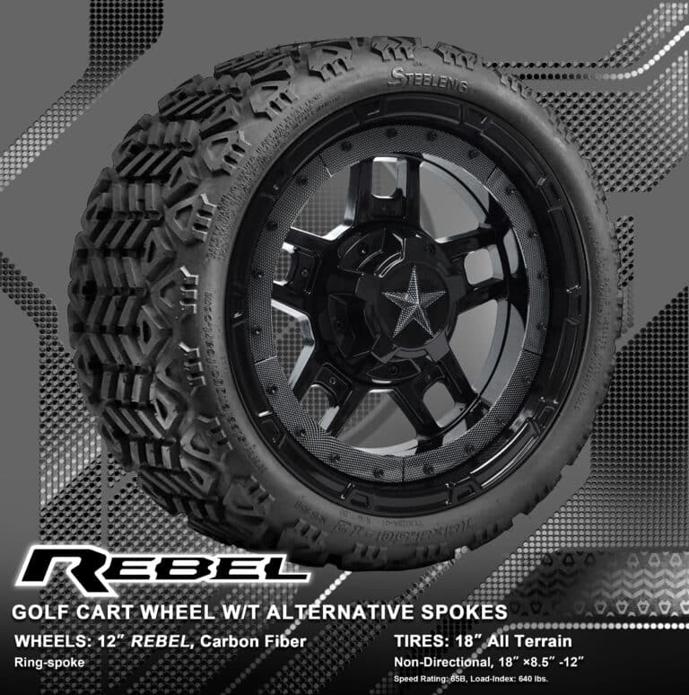 BNDL-TR1208-WH1251-WIRB01-LN0002 – SGC 12″ REBEL Glossy Black Wheel – Aluminum Alloy / STEELENG 18″x8.5″-12″ All-Terrain Tire DOT approved / REBEL Inserts-Mid Spoke-Carbon Fiber