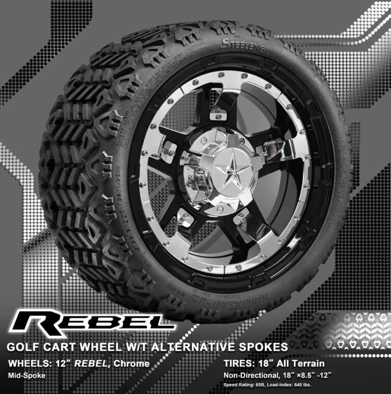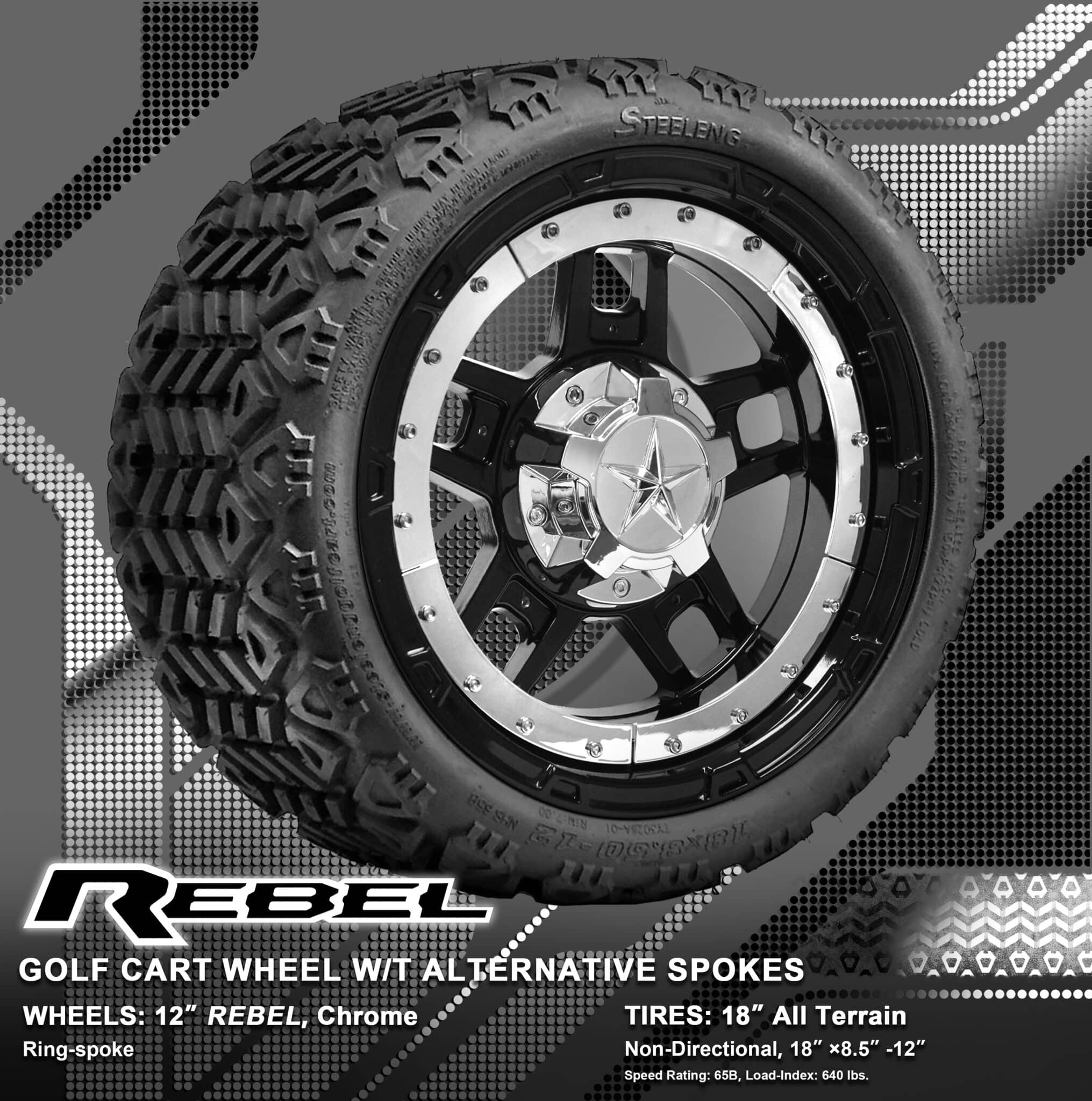 BNDL-TR1208-WH1251-WIRB02-LN0002 – SGC 12″ REBEL Glossy Black Wheel – Aluminum Alloy / STEELENG 18″x8.5″-12″ All-Terrain Tire DOT approved / REBEL Inserts-Mid Spoke-Chrome