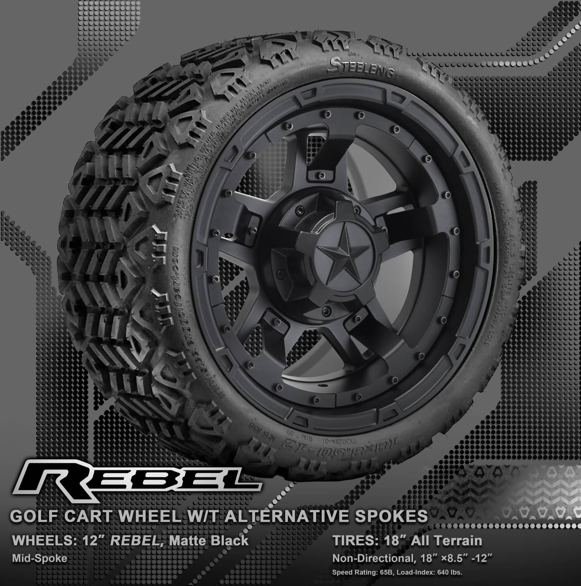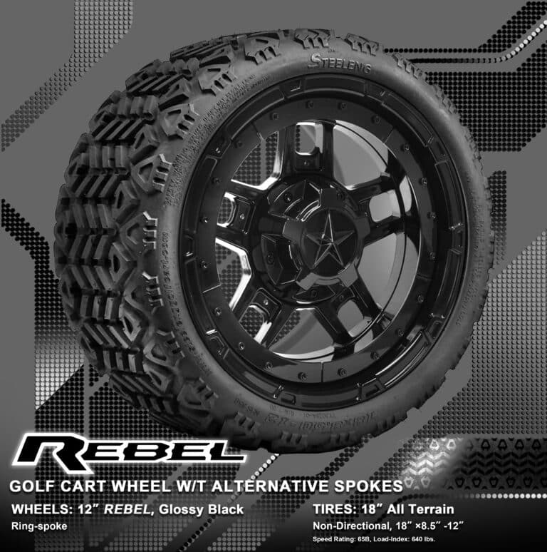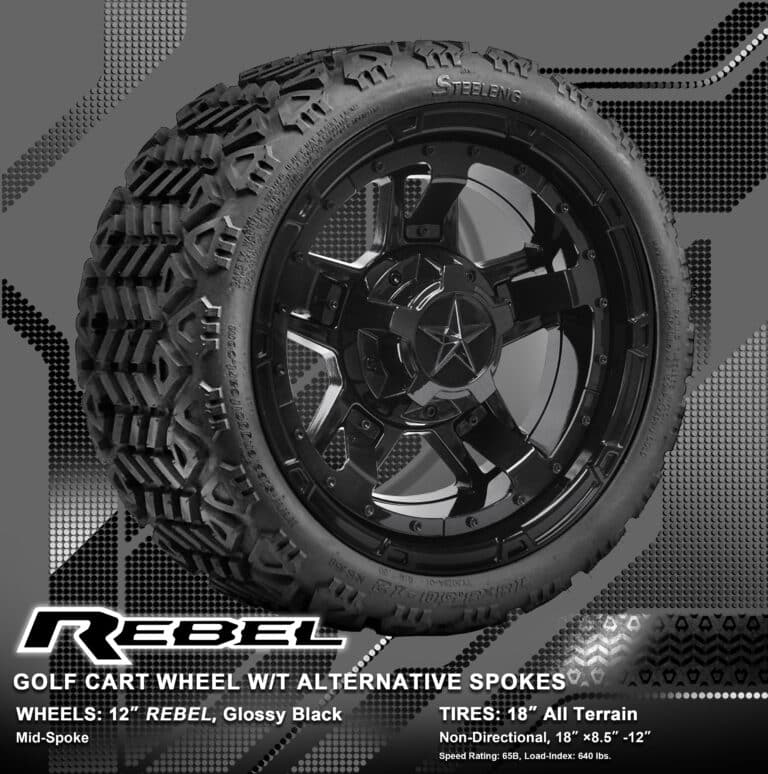 BNDL-TR1208-WH1251-WIRB13-LN0002 – SGC 12″ REBEL Glossy Black Wheel – Aluminum Alloy / STEELENG 18″x8.5″-12″ All-Terrain Tire DOT approved / REBEL Inserts-Mid Spoke-Matte Black