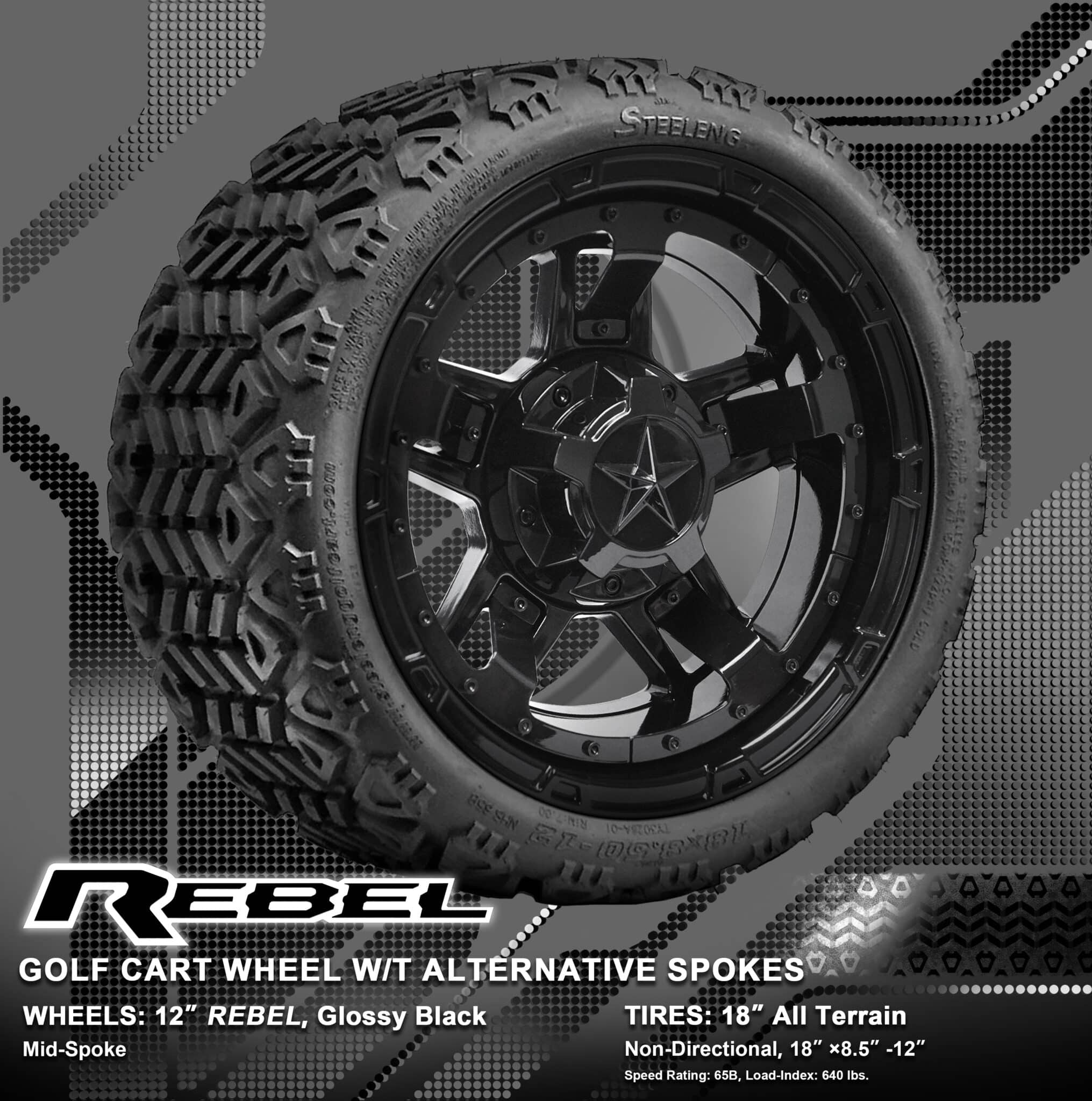 BNDL-TR1208-WH1251-WIRB03-LN0002 – SGC 12″ REBEL Glossy Black Wheel – Aluminum Alloy / STEELENG 18″x8.5″-12″ All-Terrain Tire DOT approved / REBEL Inserts-Mid Spoke-Glossy Black