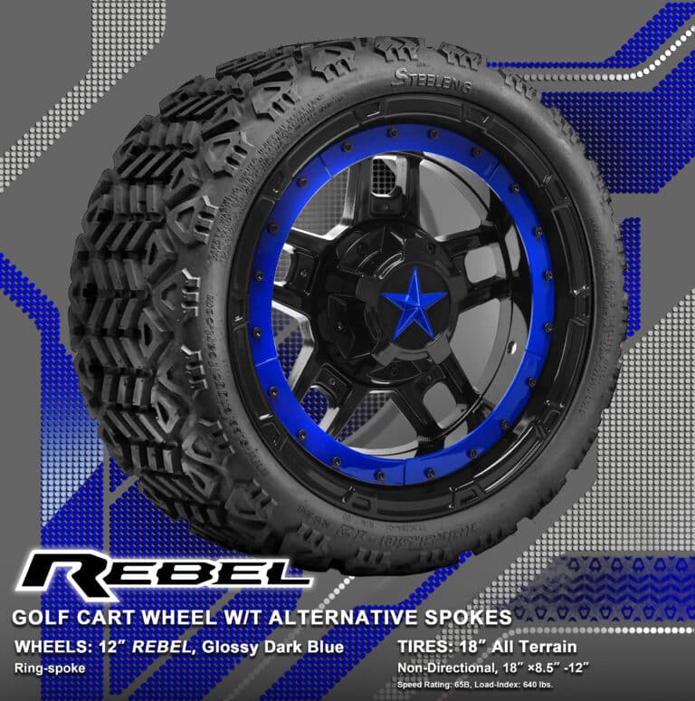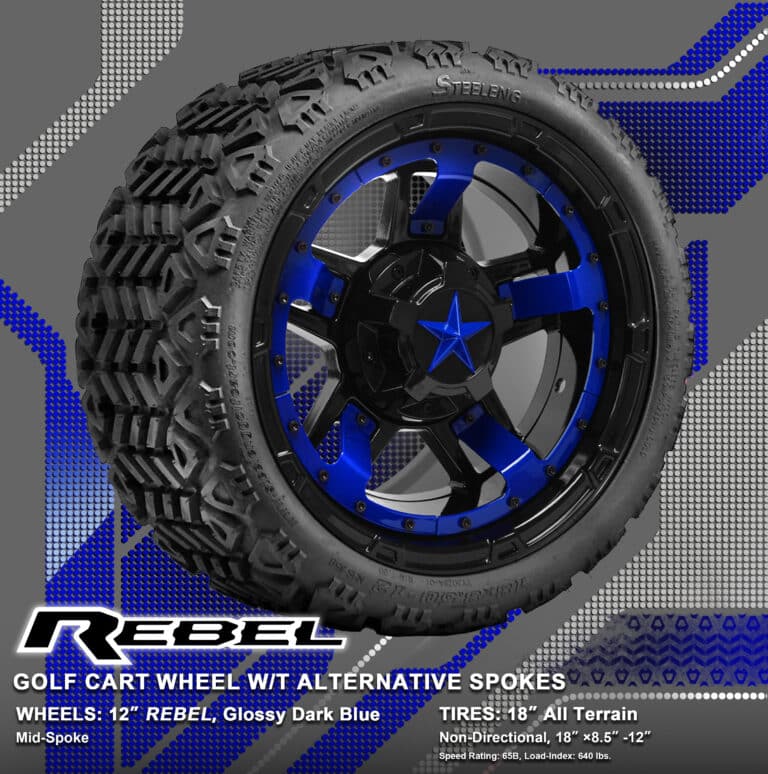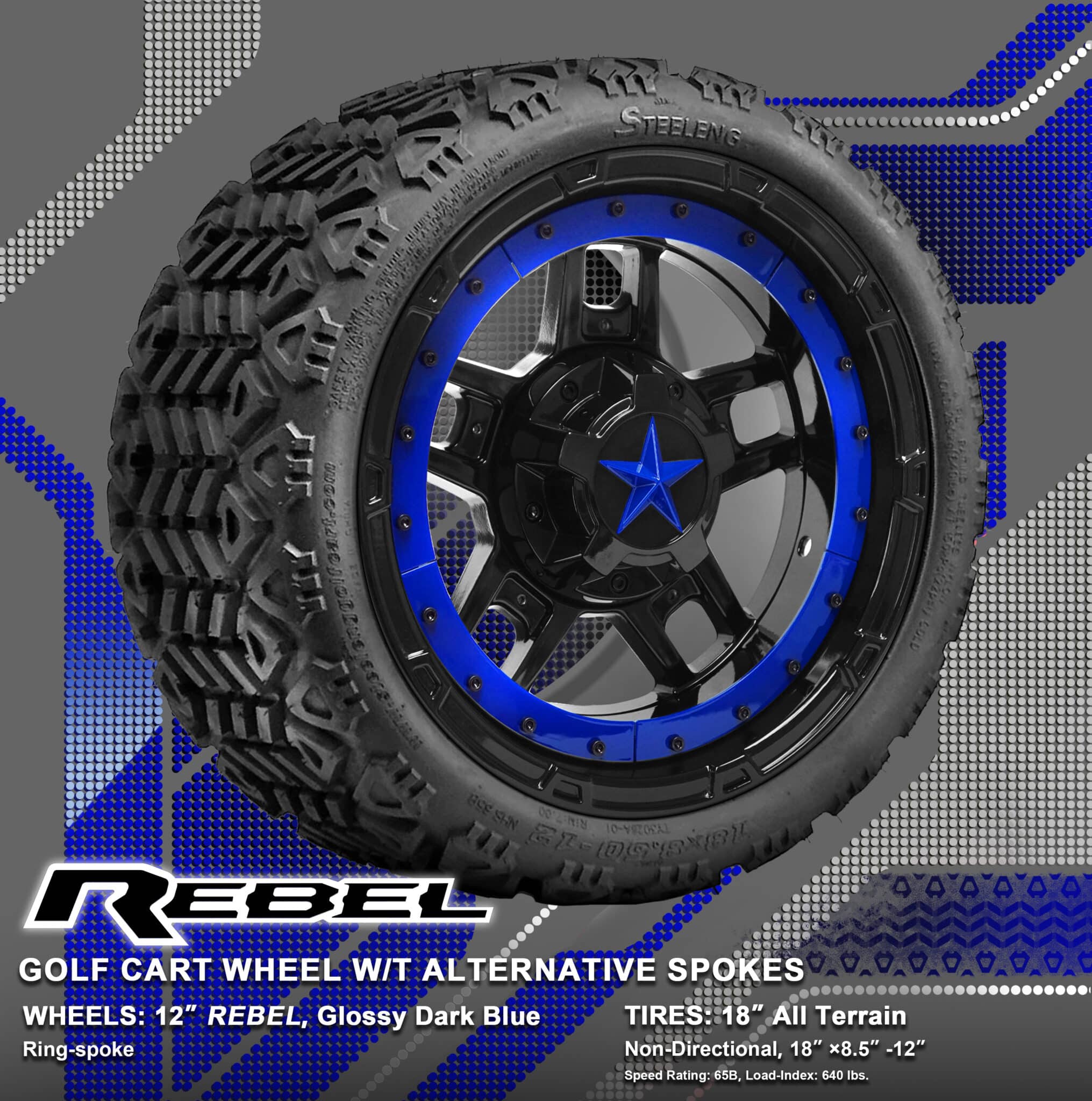 BNDL-TR1208-WH1251-WIRB04-LN0002 – SGC 12″ REBEL Glossy Black Wheel – Aluminum Alloy / STEELENG 18″x8.5″-12″ All-Terrain Tire DOT approved / REBEL Inserts-Mid Spoke-Glossy Dark Blue