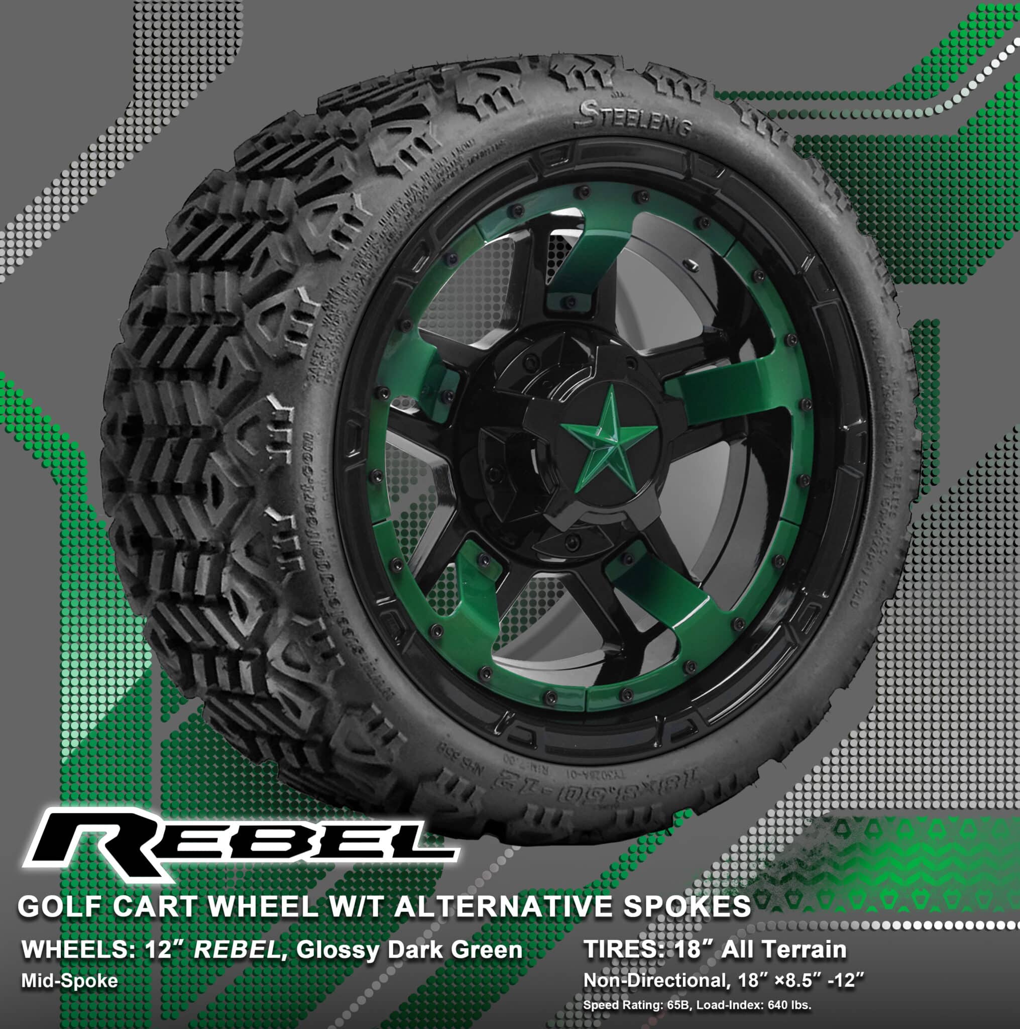 BNDL-TR1208-WH1251-WIRB05-LN0002 – SGC 12″ REBEL Glossy Black Wheel – Aluminum Alloy / STEELENG 18″x8.5″-12″ All-Terrain Tire DOT approved / REBEL Inserts-Mid Spoke-Glossy Dark Green
