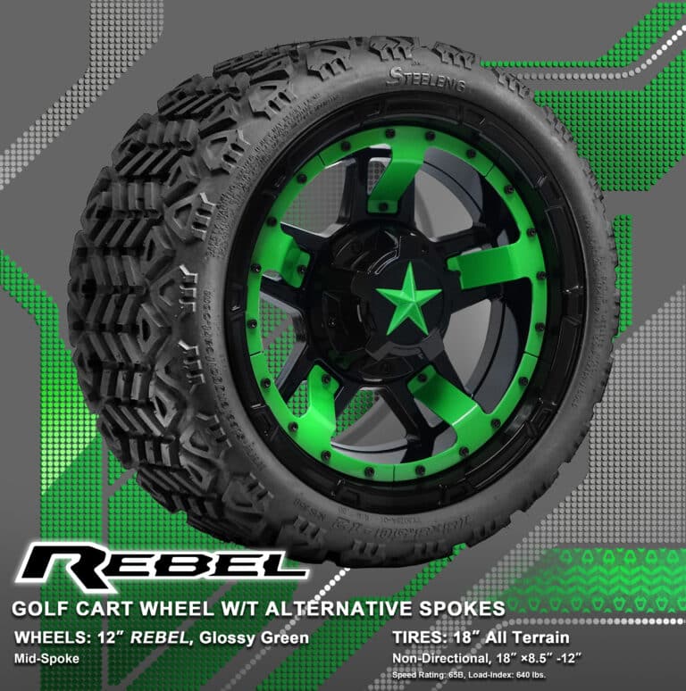 BNDL-TR1208-WH1251-WIRB06-LN0002 – SGC 12″ REBEL Glossy Black Wheel – Aluminum Alloy / STEELENG 18″x8.5″-12″ All-Terrain Tire DOT approved / REBEL Inserts-Mid Spoke-Glossy Green