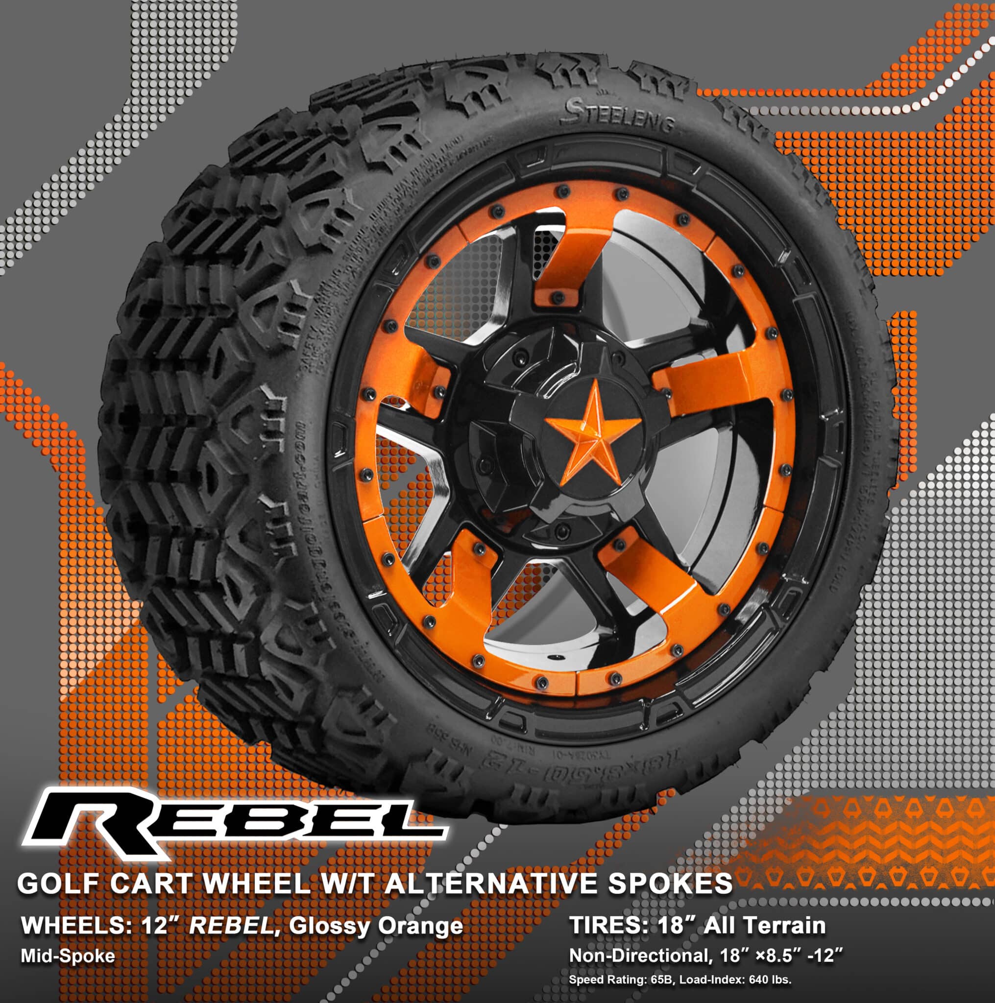 BNDL-TR1208-WH1251-WIRB07-LN0002 – SGC 12″ REBEL Glossy Black Wheel – Aluminum Alloy / STEELENG 18″x8.5″-12″ All-Terrain Tire DOT approved / REBEL Inserts-Mid Spoke-Glossy Orange