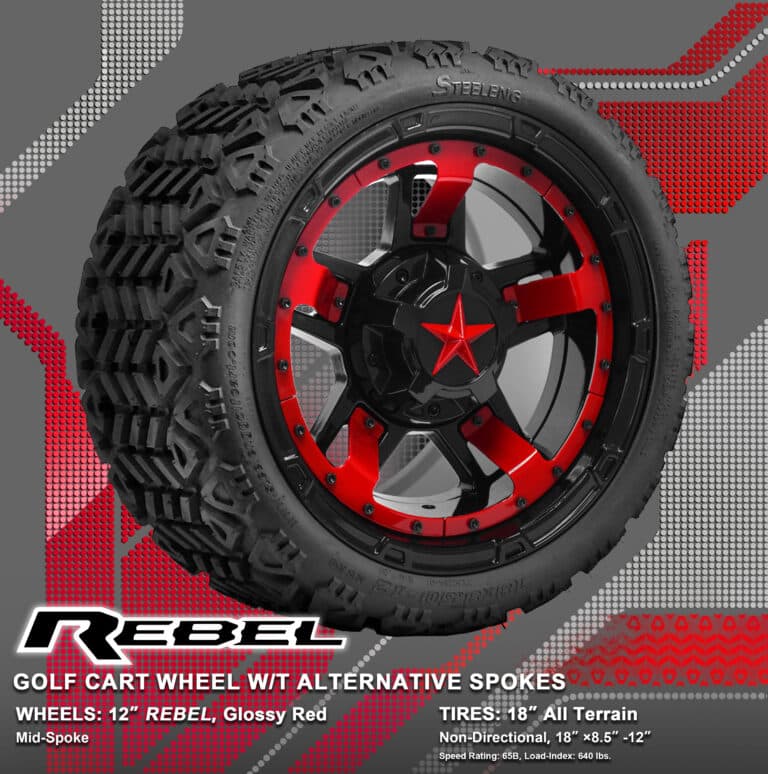 BNDL-TR1208-WH1251-WIRB08-LN0002 – SGC 12″ REBEL Glossy Black Wheel – Aluminum Alloy / STEELENG 18″x8.5″-12″ All-Terrain Tire DOT approved / REBEL Inserts-Mid Spoke-Glossy Red