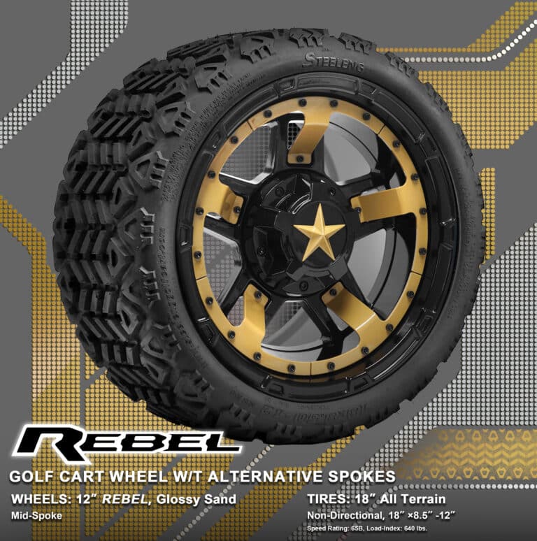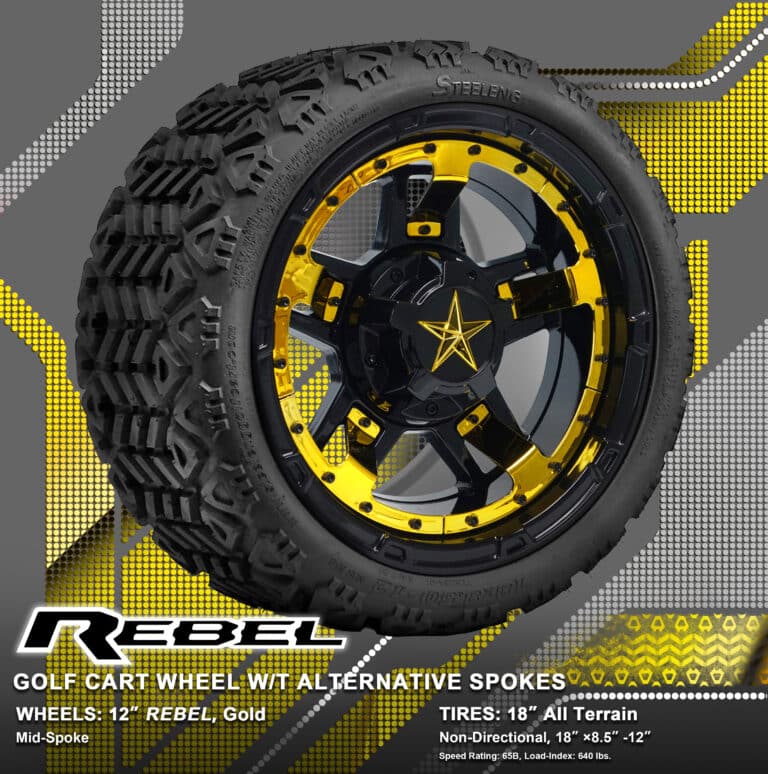 BNDL-TR1208-WH1251-WIRB12-LN0002 – SGC 12″ REBEL Glossy Black Wheel – Aluminum Alloy / STEELENG 18″x8.5″-12″ All-Terrain Tire DOT approved / REBEL Inserts-Mid Spoke-Gold
