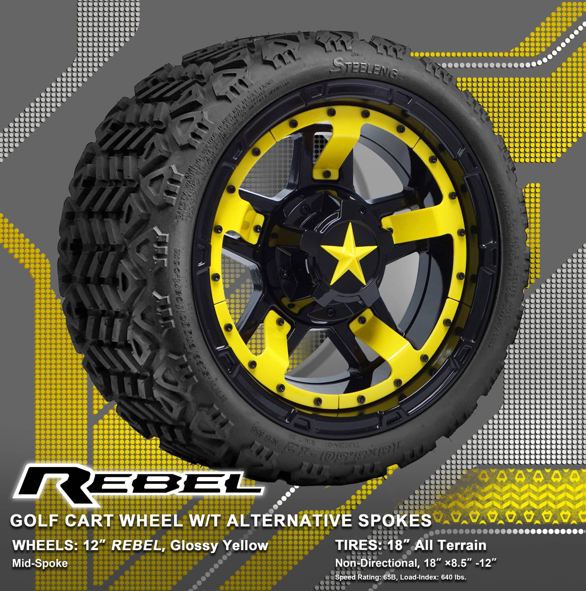 BNDL-TR1208-WH1251-WIRB11-LN0002 – SGC 12″ REBEL Glossy Black Wheel – Aluminum Alloy / STEELENG 18″x8.5″-12″ All-Terrain Tire DOT approved / REBEL Inserts-Mid Spoke-Glossy Yellow