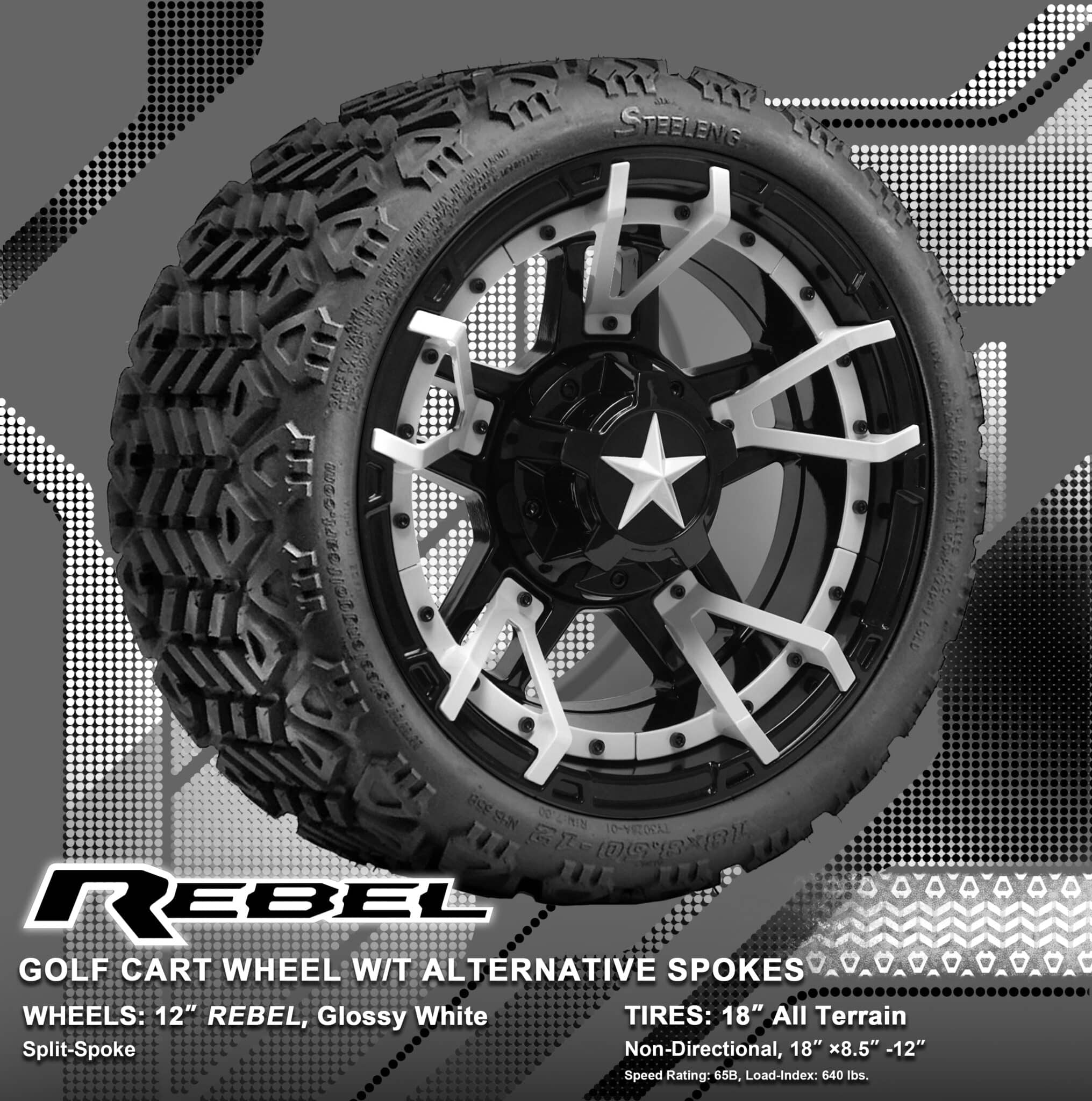 BNDL-TR1208-WH1251-WIRB36-LN0002 – SGC 12″ REBEL Glossy Black Wheel – Aluminum Alloy / STEELENG 18″x8.5″-12″ All-Terrain Tire DOT approved / REBEL Inserts-Split Spoke-Glossy White