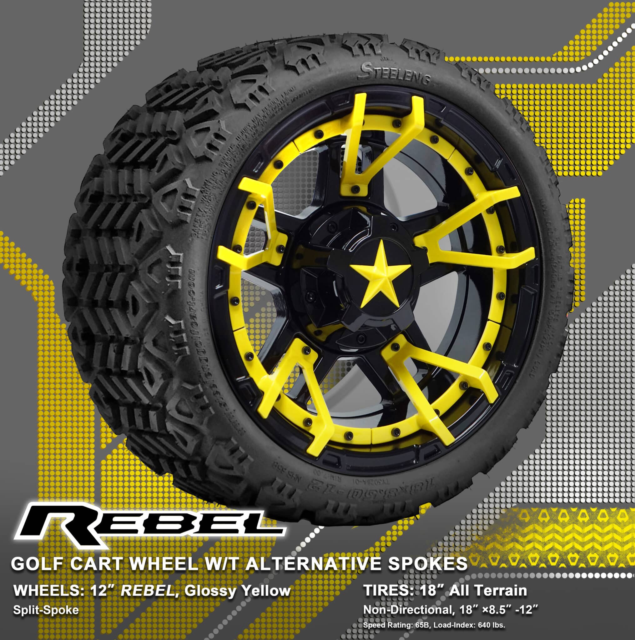 BNDL-TR1208-WH1251-WIRB37-LN0002 – SGC 12″ REBEL Glossy Black Wheel – Aluminum Alloy / STEELENG 18″x8.5″-12″ All-Terrain Tire DOT approved / REBEL Inserts-Split Spoke-Glossy Yellow