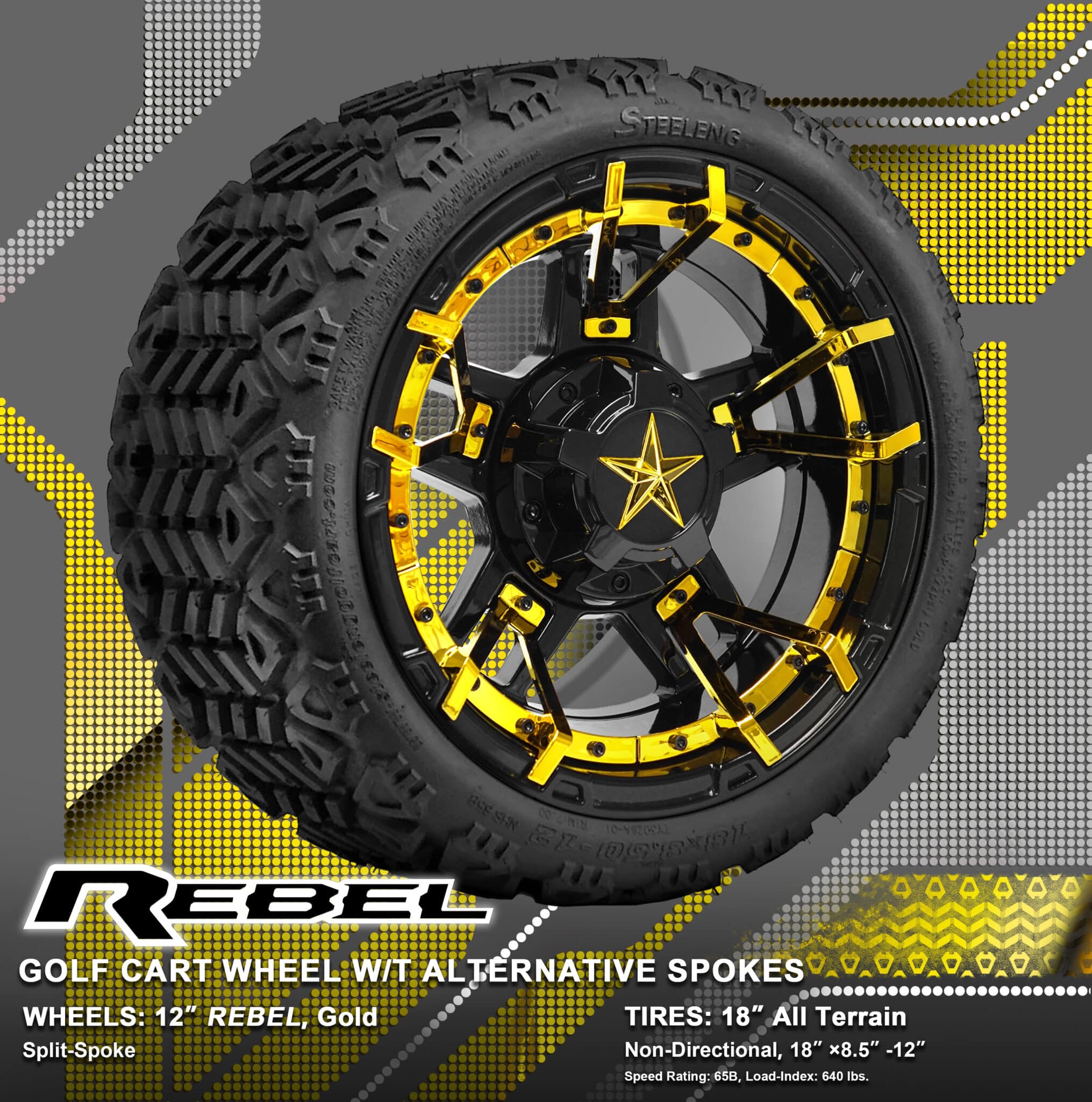 BNDL-TR1208-WH1251-WIRB38-LN0002 – SGC 12″ REBEL Glossy Black Wheel – Aluminum Alloy / STEELENG 18″x8.5″-12″ All-Terrain Tire DOT approved / REBEL Inserts-Split Spoke-Gold