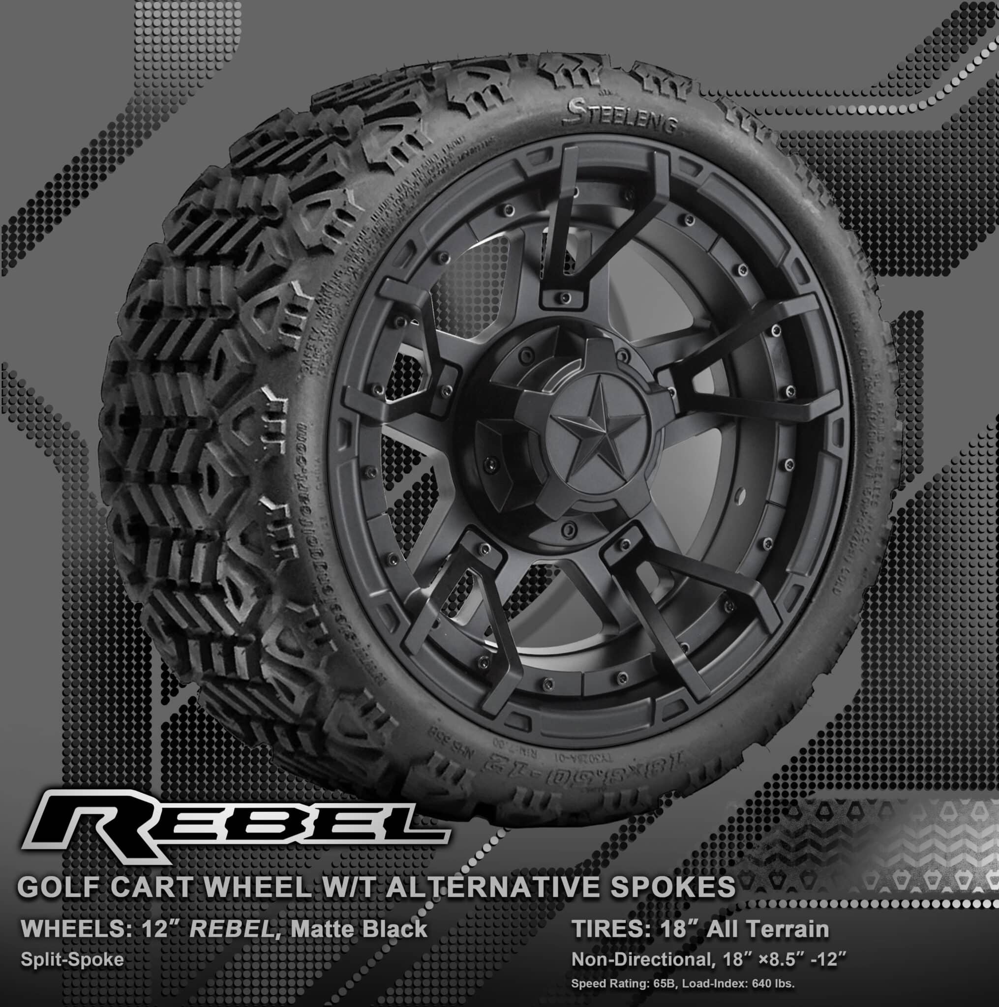 BNDL-TR1208-WH1251-WIRB39-LN0002 – SGC 12″ REBEL Glossy Black Wheel – Aluminum Alloy / STEELENG 18″x8.5″-12″ All-Terrain Tire DOT approved / REBEL Inserts-Split Spoke-Matte Black