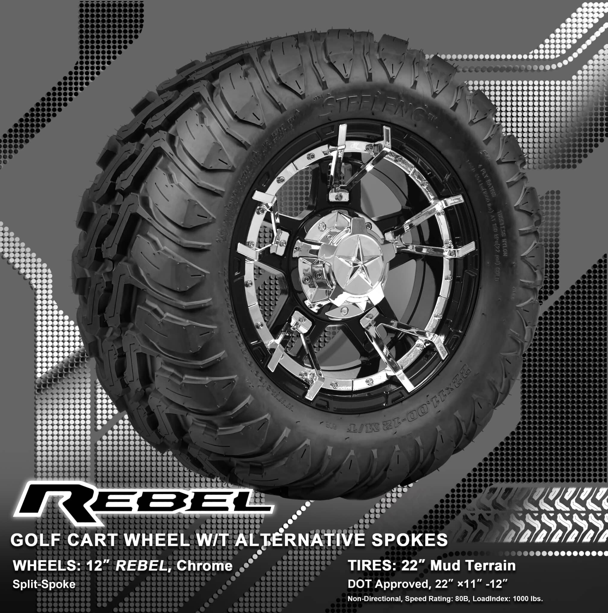 BNDL-TR1209-WH1251-WIRB28-LN0002 – SGC 12″ REBEL Glossy Black Wheel – Aluminum Alloy / STEELENG 22″x11″-12″ Mud Terrain / All Terrain Tire DOT Approved / REBEL Inserts-Split Spoke-Chrome