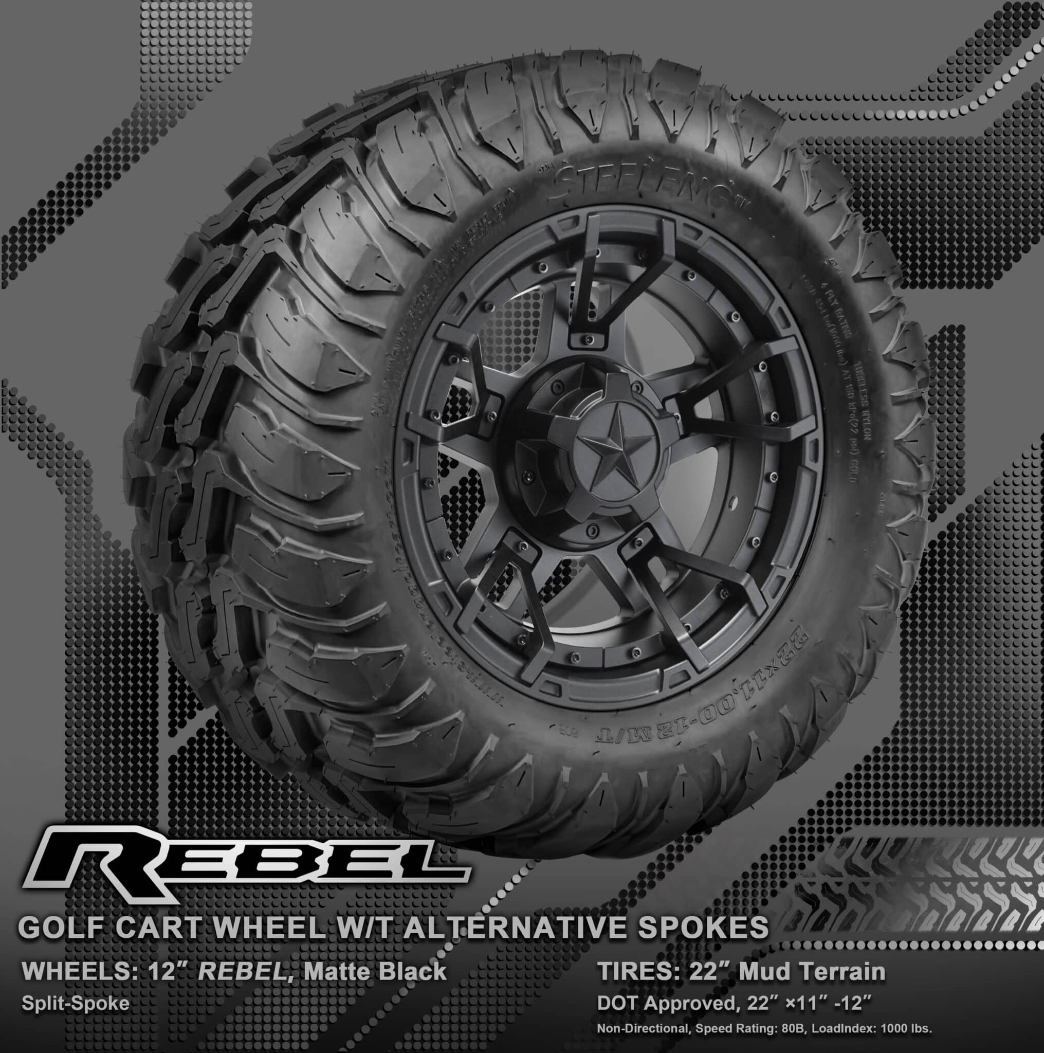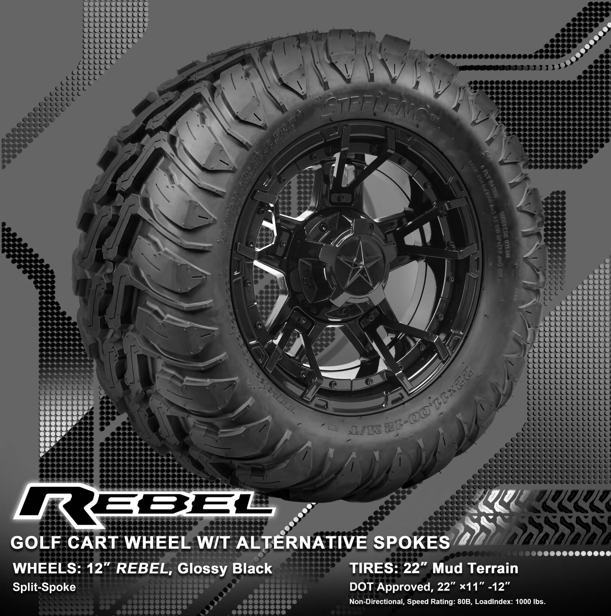 BNDL-TR1209-WH1251-WIRB39-LN0002 – SGC 12″ REBEL Glossy Black Wheel – Aluminum Alloy / STEELENG 22″x11″-12″ Mud Terrain / All Terrain Tire DOT Approved / REBEL Inserts-Split Spoke-Matte Black