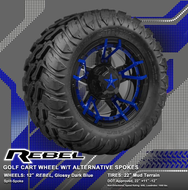 BNDL-TR1209-WH1251-WIRB30-LN0002 – SGC 12″ REBEL Glossy Black Wheel – Aluminum Alloy / STEELENG 22″x11″-12″ Mud Terrain / All Terrain Tire DOT Approved / REBEL Inserts-Split Spoke-Glossy Dark Blue