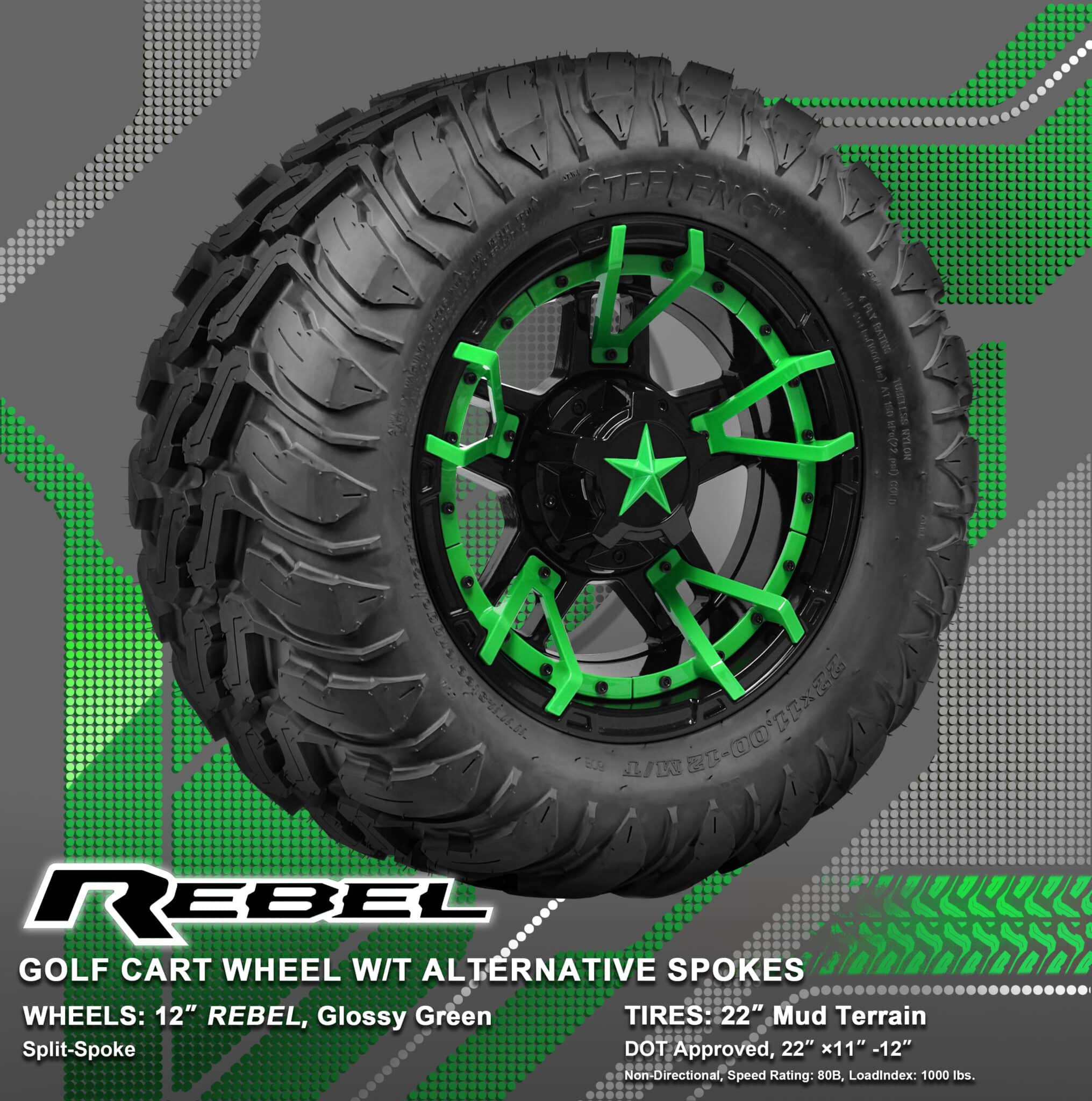 BNDL-TR1209-WH1251-WIRB32-LN0002 – SGC 12″ REBEL Glossy Black Wheel – Aluminum Alloy / STEELENG 22″x11″-12″ Mud Terrain / All Terrain Tire DOT Approved / REBEL Inserts-Split Spoke-Glossy Green