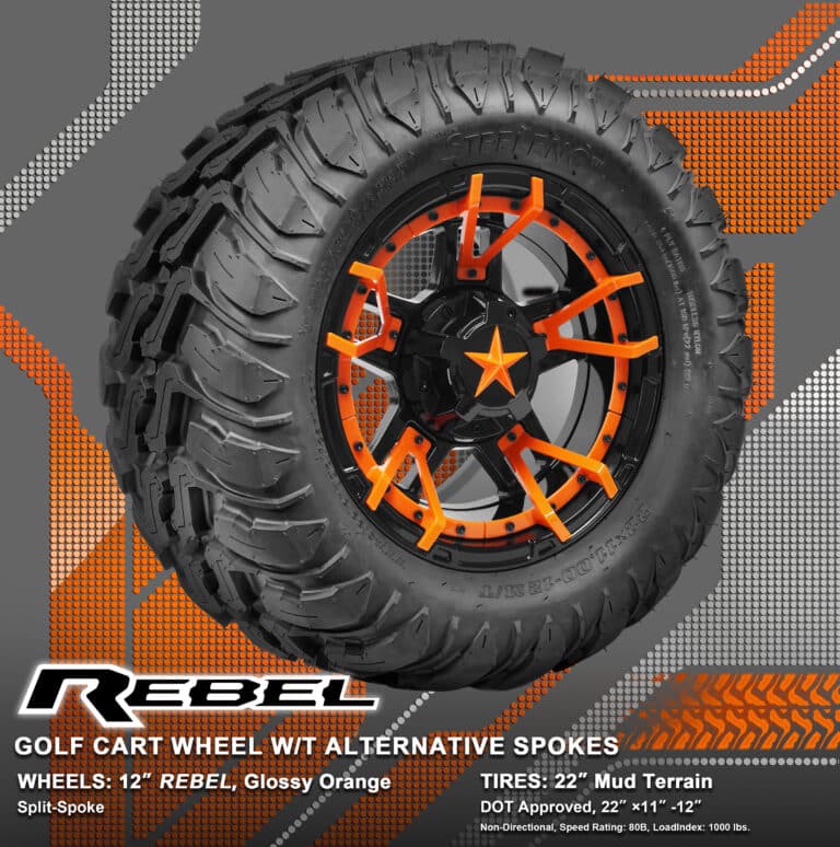 BNDL-TR1209-WH1251-WIRB33-LN0002 – SGC 12″ REBEL Glossy Black Wheel – Aluminum Alloy / STEELENG 22″x11″-12″ Mud Terrain / All Terrain Tire DOT Approved / REBEL Inserts-Split Spoke-Glossy Orange