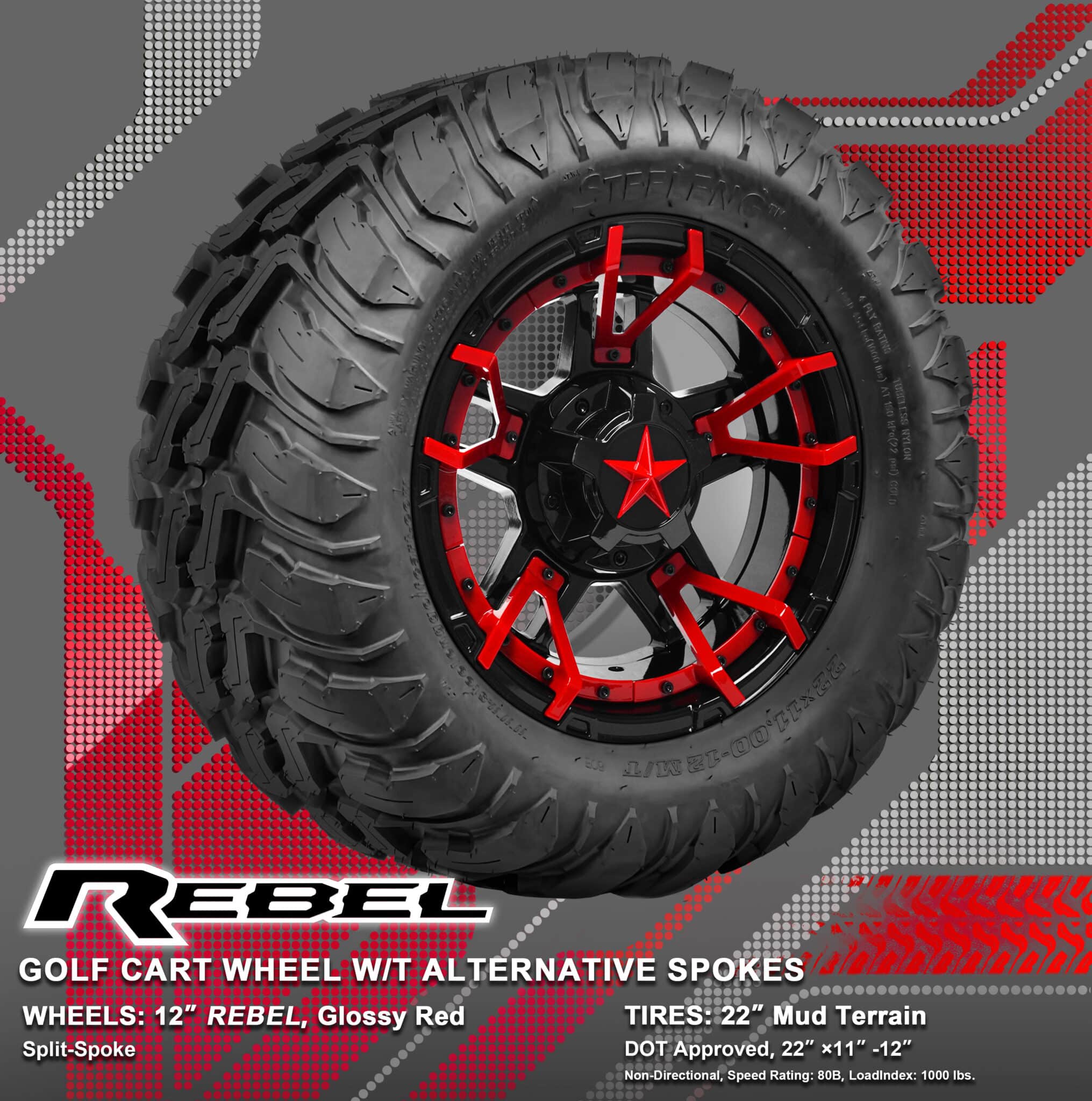 BNDL-TR1209-WH1251-WIRB34-LN0002 – SGC 12″ REBEL Glossy Black Wheel – Aluminum Alloy / STEELENG 22″x11″-12″ Mud Terrain / All Terrain Tire DOT Approved / REBEL Inserts-Split Spoke-Glossy Red
