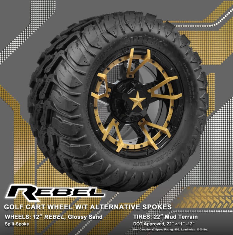 BNDL-TR1209-WH1251-WIRB35-LN0002 – SGC 12″ REBEL Glossy Black Wheel – Aluminum Alloy / STEELENG 22″x11″-12″ Mud Terrain / All Terrain Tire DOT Approved / REBEL Inserts-Split Spoke-Glossy Sand