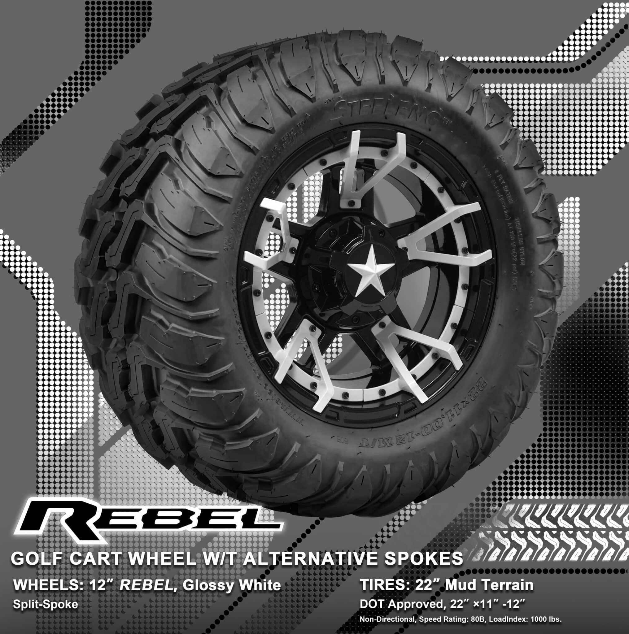 BNDL-TR1209-WH1251-WIRB36-LN0002 – SGC 12″ REBEL Glossy Black Wheel – Aluminum Alloy / STEELENG 22″x11″-12″ Mud Terrain / All Terrain Tire DOT Approved / REBEL Inserts-Split Spoke-Glossy White