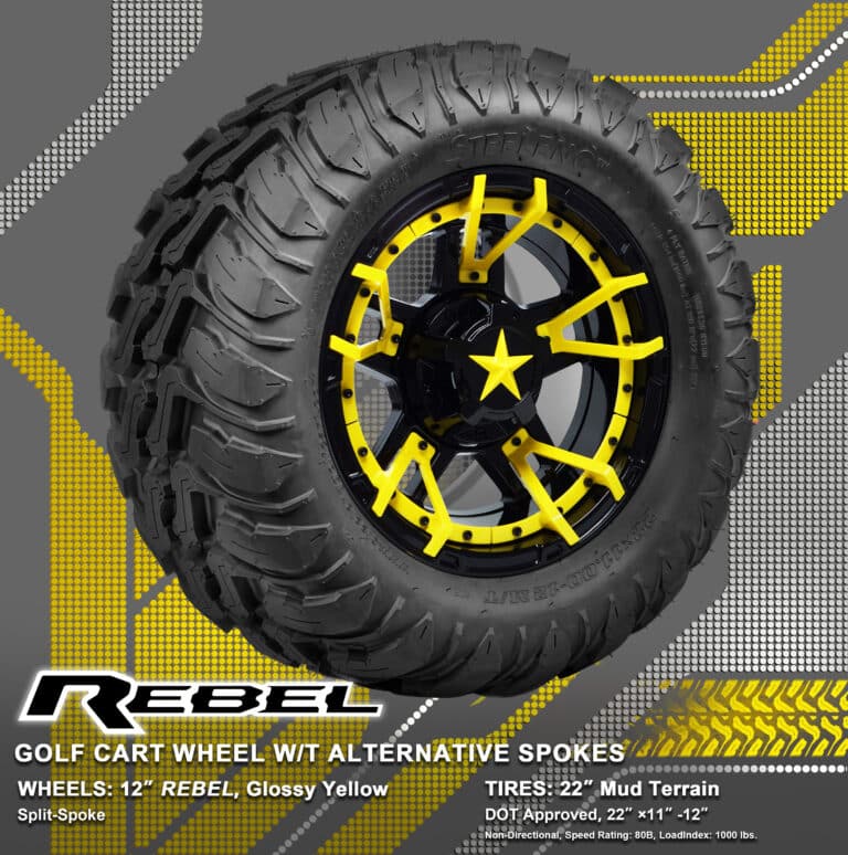 BNDL-TR1209-WH1251-WIRB37-LN0002 – SGC 12″ REBEL Glossy Black Wheel – Aluminum Alloy / STEELENG 22″x11″-12″ Mud Terrain / All Terrain Tire DOT Approved / REBEL Inserts-Split Spoke-Glossy Yellow