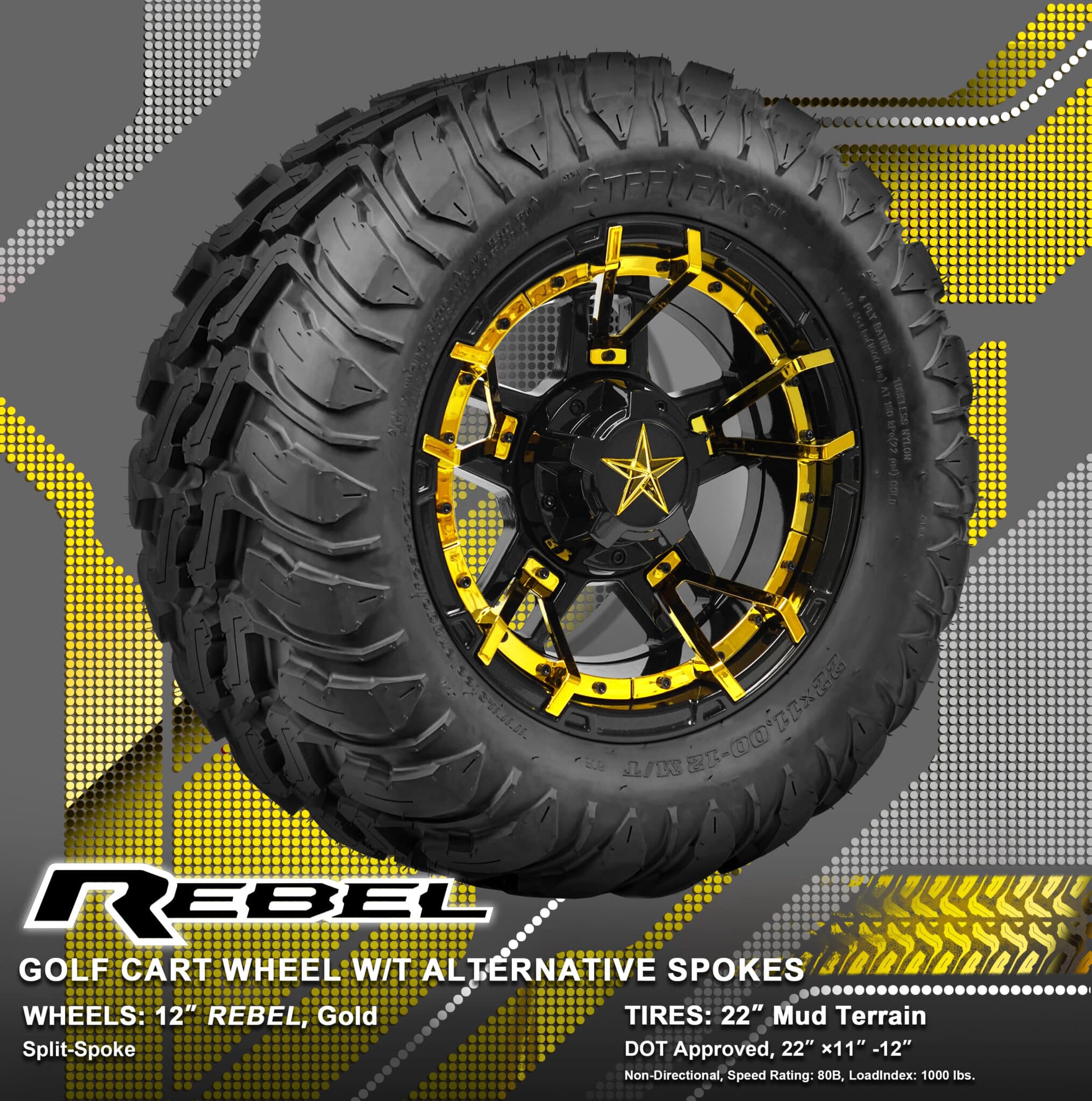 BNDL-TR1209-WH1251-WIRB38-LN0002 – SGC 12″ REBEL Glossy Black Wheel – Aluminum Alloy / STEELENG 22″x11″-12″ Mud Terrain / All Terrain Tire DOT Approved / REBEL Inserts-Split Spoke-Gold