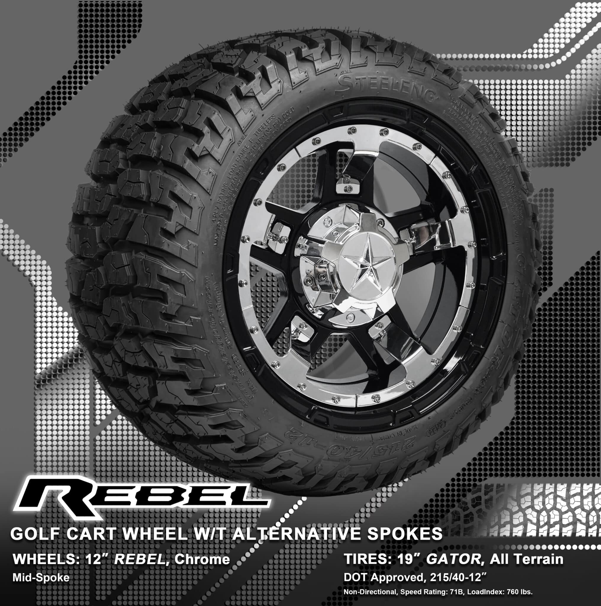 BNDL-TR1210-WH1251-WIRB02-LN0002 – SGC 12″ REBEL Glossy Black Wheel – Aluminum Alloy / STEELENG 215/40-12 GATOR Hybrid Low Profile / All Terrain Tire DOT Approved / REBEL Inserts-Mid Spoke-Chrome