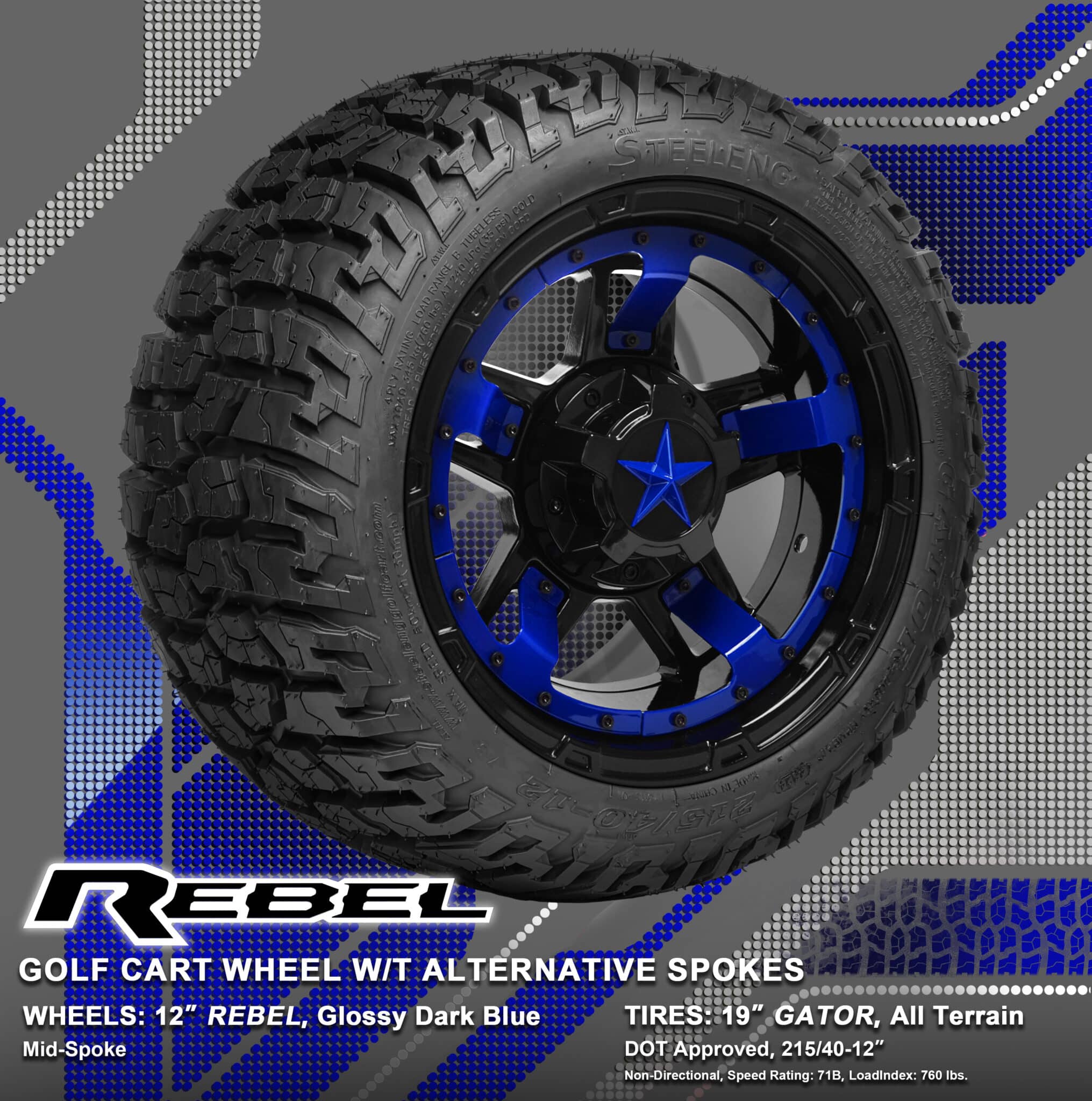 BNDL-TR1210-WH1251-WIRB04-LN0002 – SGC 12″ REBEL Glossy Black Wheel – Aluminum Alloy / STEELENG 215/40-12 GATOR Hybrid Low Profile / All Terrain Tire DOT Approved / REBEL Inserts-Mid Spoke-Glossy Dark Blue