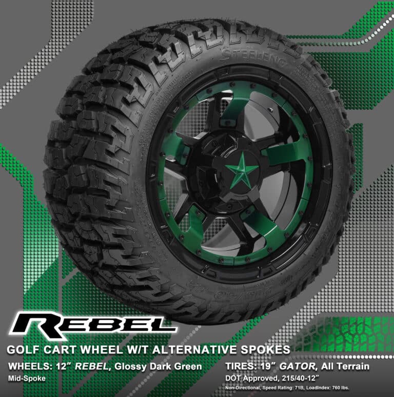 BNDL-TR1210-WH1251-WIRB05-LN0002 – SGC 12″ REBEL Glossy Black Wheel – Aluminum Alloy / STEELENG 215/40-12 GATOR Hybrid Low Profile / All Terrain Tire DOT Approved / REBEL Inserts-Mid Spoke-Glossy Dark Green