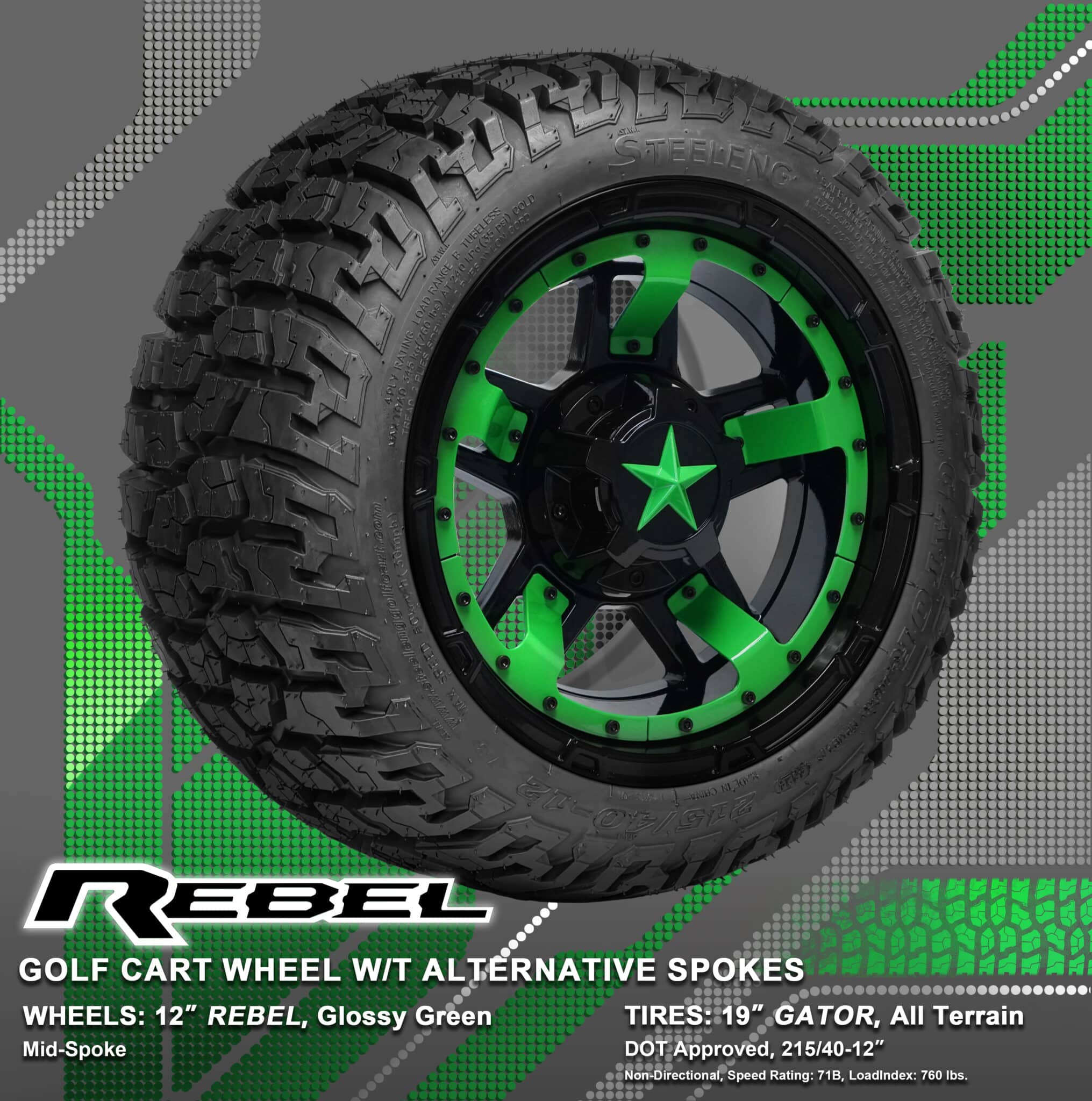 BNDL-TR1210-WH1251-WIRB06-LN0002 – SGC 12″ REBEL Glossy Black Wheel – Aluminum Alloy / STEELENG 215/40-12 GATOR Hybrid Low Profile / All Terrain Tire DOT Approved / REBEL Inserts-Mid Spoke-Glossy Green