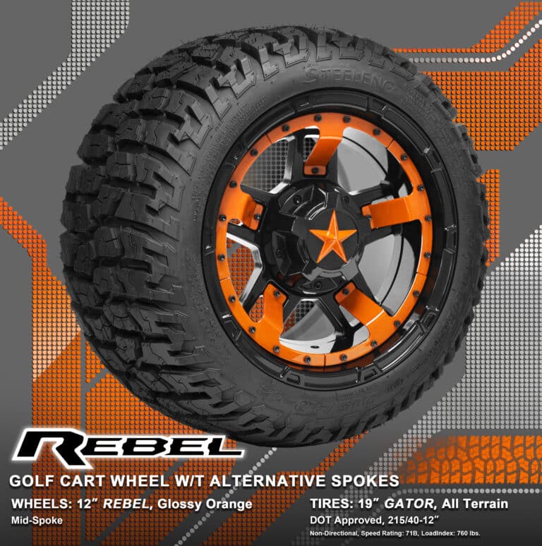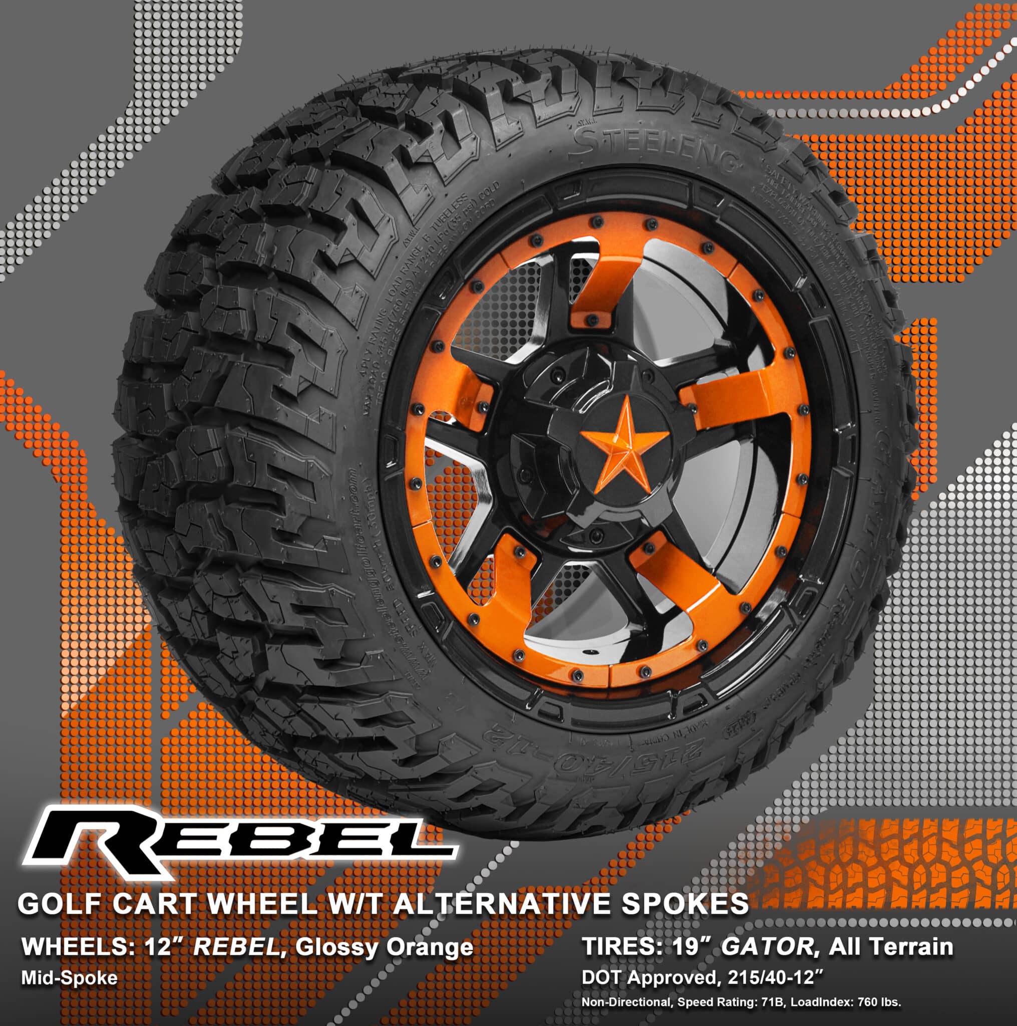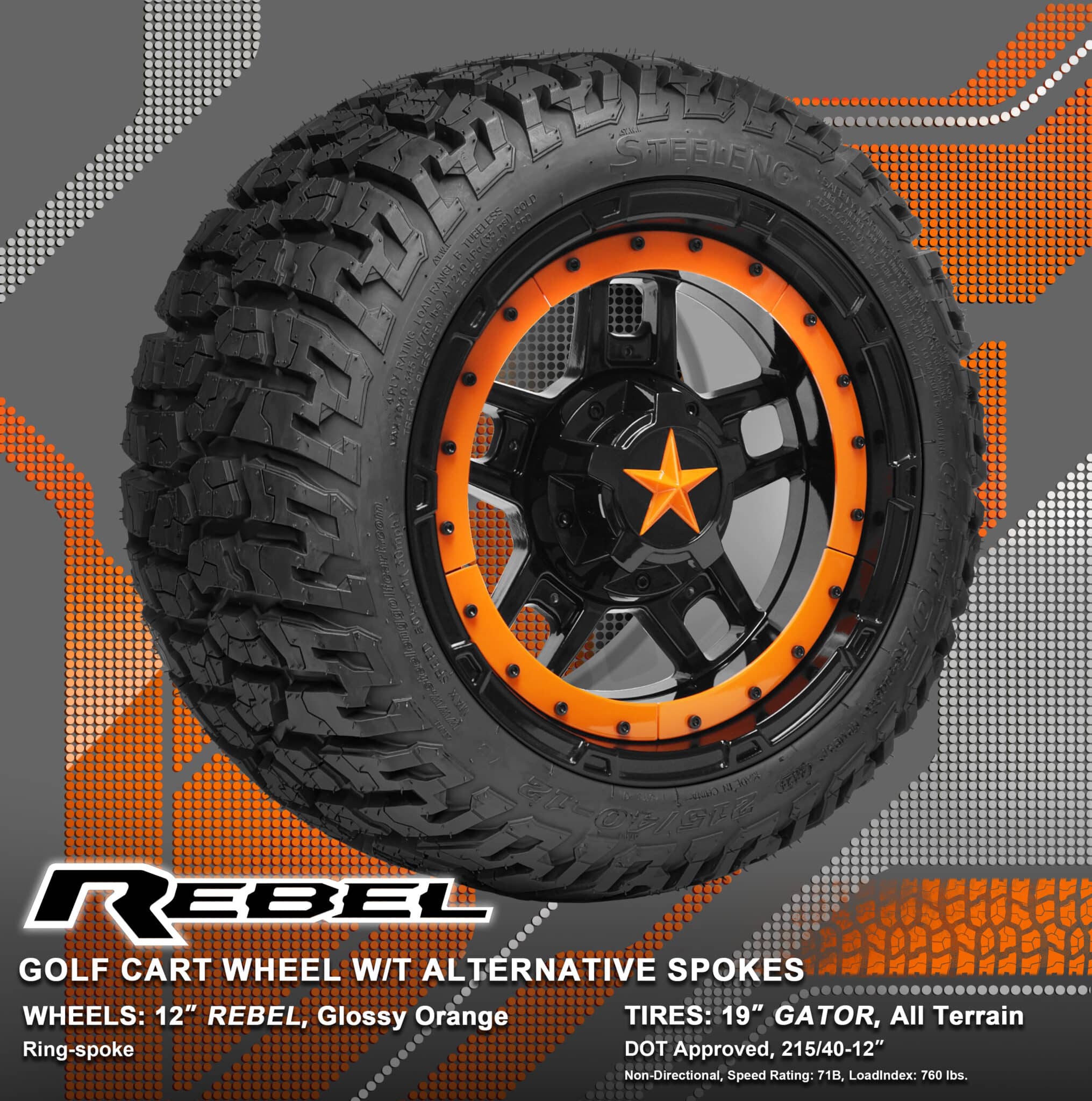 BNDL-TR1210-WH1251-WIRB07-LN0002 – SGC 12″ REBEL Glossy Black Wheel – Aluminum Alloy / STEELENG 215/40-12 GATOR Hybrid Low Profile / All Terrain Tire DOT Approved / REBEL Inserts-Mid Spoke-Glossy Orange