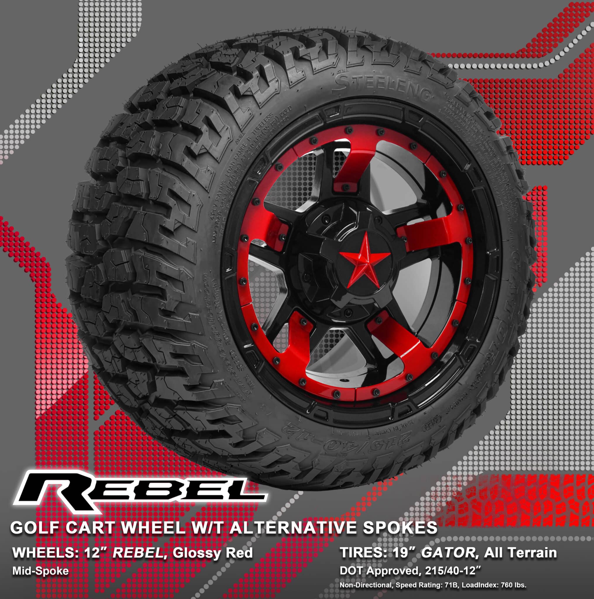 BNDL-TR1210-WH1251-WIRB08-LN0002 – SGC 12″ REBEL Glossy Black Wheel – Aluminum Alloy / STEELENG 215/40-12 GATOR Hybrid Low Profile / All Terrain Tire DOT Approved / REBEL Inserts-Mid Spoke-Glossy Red