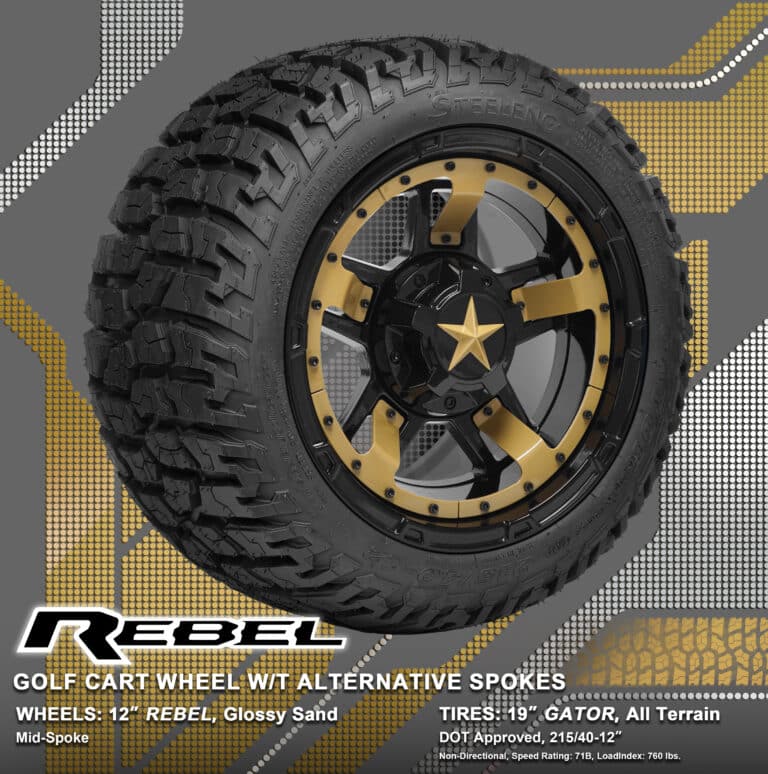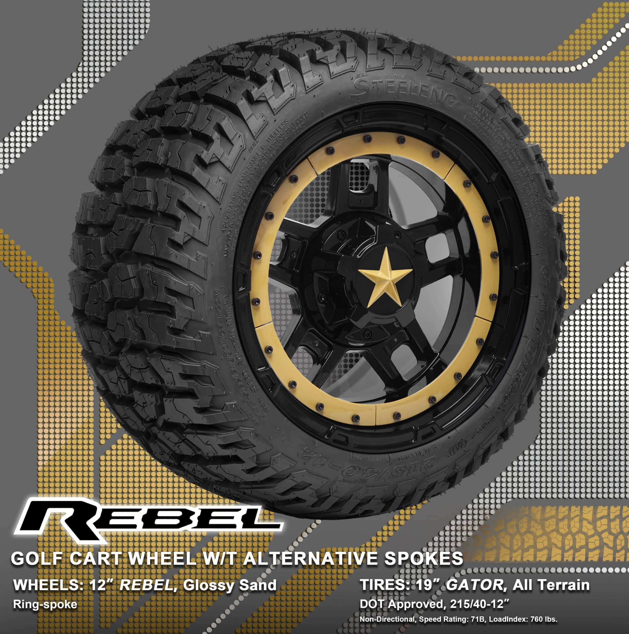 BNDL-TR1210-WH1251-WIRB09-LN0002 – SGC 12″ REBEL Glossy Black Wheel – Aluminum Alloy / STEELENG 215/40-12 GATOR Hybrid Low Profile / All Terrain Tire DOT Approved / REBEL Inserts-Mid Spoke-Glossy Sand