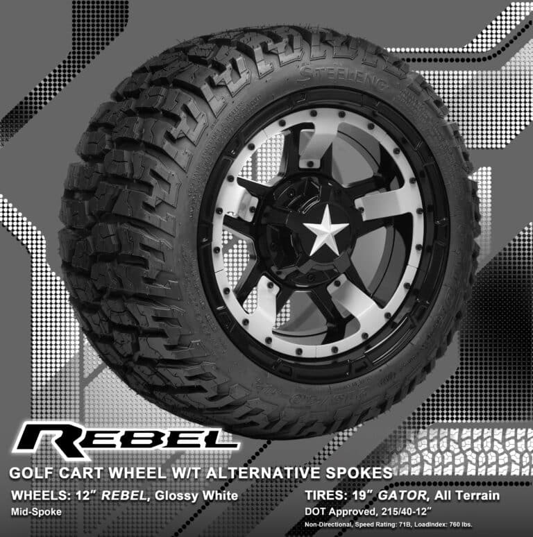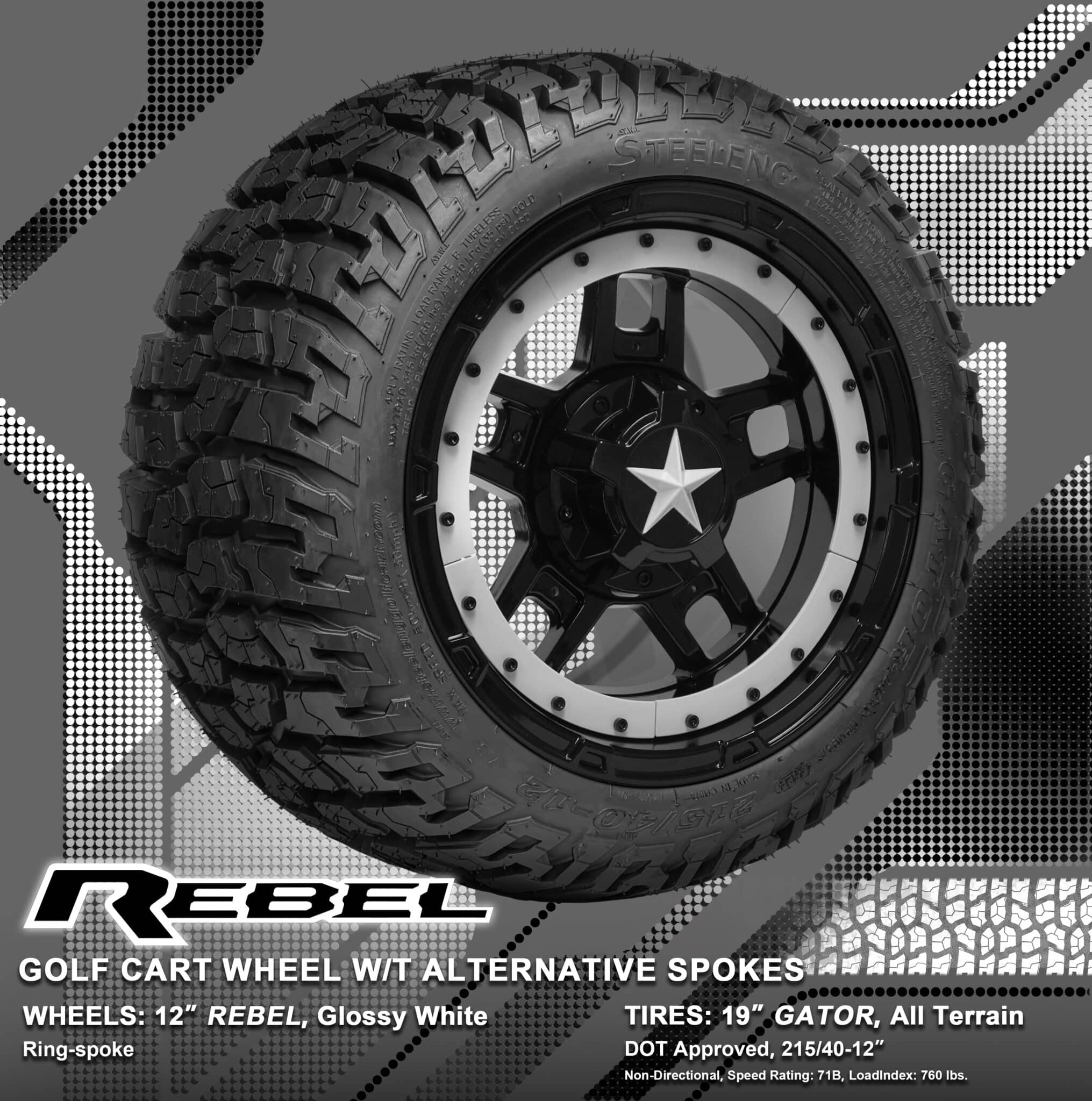 BNDL-TR1210-WH1251-WIRB10-LN0002 – SGC 12″ REBEL Glossy Black Wheel – Aluminum Alloy / STEELENG 215/40-12 GATOR Hybrid Low Profile / All Terrain Tire DOT Approved / REBEL Inserts-Mid Spoke-Glossy White